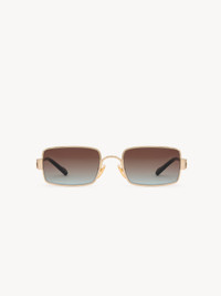 DESCRIPTION These Holly rectangular sunglasses pair a narrow, lightweight gold metal frame with gradient turquoise lenses. A Chloe logo engraving details the temples. Drop-shaped openings at the temple tips make these sunglasses compatible with Chloe's eyewear jewelry. PRODUCT DETAILS Rectangular sunglasses in gold metal & bio-based nylon - 100% UVA and UVB protection - Adjustable nose pads engraved with the Chloe logo - Prescription friendly - Chloe logo engraved on the temples - Filter category: 2 These sunglasses come with a case and lens cloth - Lens: 2.1" (53 mm) - Bridge: 0.8" (20 mm) - Temple: 5.5" (140 mm) - Gold metal frame - Gradient turquoise lenses Item code: CH26SEK0354839 CARE INSTRUCTIONS These sunglasses/eyeglasses are made with carefully selected materials. Please handle with care for a longer product life.- Store in the case provided.- Clean with a soft, dry cloth.- If necessary, use a damp cloth and mild detergent. Do not use solvents or aggressive detergents which may alter the features of the sunglasses/eyewear