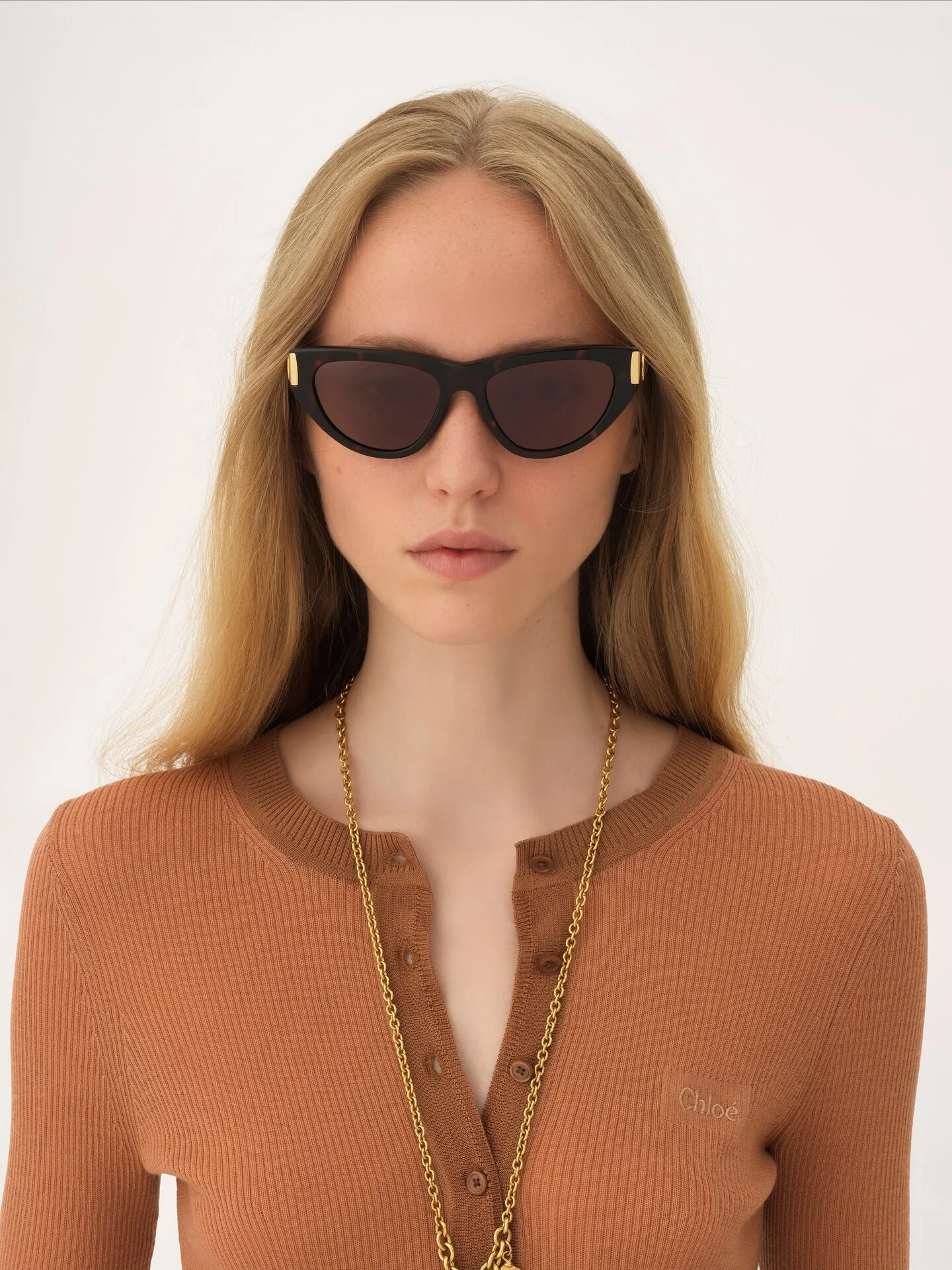 DESCRIPTION These Holly cat-eye sunglasses feature a Dark Havana lower-impact acetate frame with solid burgundy lenses, elevated by distinctive gold metal temples engraved with the Chloe logo. Drop-shaped openings at the temple tips make these sunglasses compatible with Chloe's eyewear jewelry. PRODUCT DETAILS Cat-eye sunglasses in lower-impact acetate, gold metal & bio-based nylon - 100% UVA and UVB protection - Prescription friendly - Chloe logo engraved on the temples - Filter category: 2 These sunglasses come with a case and lens cloth - Lens: 2.1" (54 mm) - Bridge: 0.7" (17 mm) - Temple: 5.5" (140 mm) - Dark Havana lower-impact acetate frame - Solid burgundy lenses Item code: CH26SEK0350215 CARE INSTRUCTIONS These sunglasses/eyeglasses are made with carefully selected materials. Please handle with care for a longer product life.- Store in the case provided.- Clean with a soft, dry cloth.- If necessary, use a damp cloth and mild detergent. Do not use solvents or aggressive detergents which may alter the features of the sunglasses/eyewear