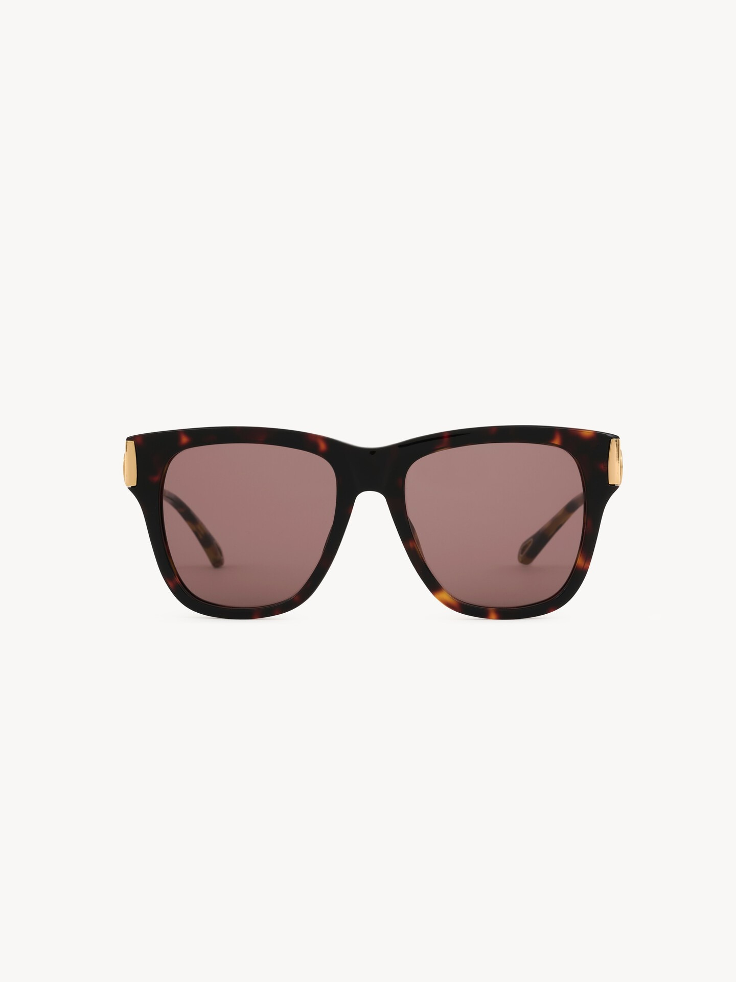 DESCRIPTION These Holly vintage square sunglasses feature a Dark Havana lower-impact acetate frame with solid burgundy lenses, elevated by distinctive gold metal temples engraved with the Chloe logo. Drop-shaped openings at the temple tips make these sunglasses compatible with Chloe's eyewear jewelry. PRODUCT DETAILS Square sunglasses in lower-impact acetate, gold metal & bio-based nylon - 100% UVA and UVB protection - Prescription friendly - Chloe logo engraved on the temples - Filter category: 2 These sunglasses come with a case and lens cloth - Lens: 2.1" (54 mm) - Bridge: 0.7" (18 mm) - Temple: 5.5" (140 mm) - Dark Havana lower-impact acetate frame - Solid burgundy lenses Item code: CH26SEK0349215 CARE INSTRUCTIONS These sunglasses/eyeglasses are made with carefully selected materials. Please handle with care for a longer product life.- Store in the case provided.- Clean with a soft, dry cloth.- If necessary, use a damp cloth and mild detergent. Do not use solvents or aggressive detergents which may alter the features of the sunglasses/eyewear