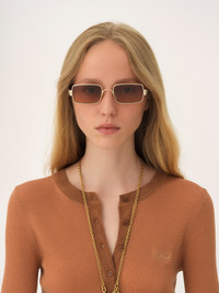 DESCRIPTION These Holly rectangular sunglasses pair a narrow, lightweight gold metal frame with gradient brown lenses. A Chloe logo engraving details the temples. Drop-shaped openings at the temple tips make these sunglasses compatible with Chloe's eyewear jewelry. PRODUCT DETAILS Rectangular sunglasses in gold metal & bio-based nylon - 100% UVA and UVB protection - Adjustable nose pads engraved with the Chloe logo - Prescription friendly - Chloe logo engraved on the temples - Filter category: 2 These sunglasses come with a case and lens cloth - Lens: 2.1" (53 mm) - Bridge: 0.8" (20 mm) - Temple: 5.5" (140 mm) - Gold metal frame - Gradient brown lenses Item code: CH26SEK0354767