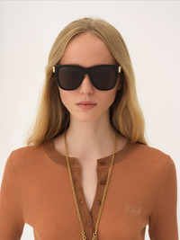 DESCRIPTION These Holly vintage square sunglasses feature a black lower-impact acetate frame with solid dark gray lenses, elevated by distinctive gold metal temples engraved with the Chloe logo. Drop-shaped openings at the temple tips make these sunglasses compatible with Chloe's eyewear jewelry. PRODUCT DETAILS Square sunglasses in lower-impact acetate, gold metal & bio-based nylon - 100% UVA and UVB protection - Prescription friendly - Chloe logo engraved on the temples - Filter category: 3 These sunglasses come with a case and lens cloth - Lens: 2.1" (54 mm) - Bridge: 0.7" (18 mm) - Temple: 5.5" (140 mm) - Black lower-impact acetate frame - Solid dark gray lenses Item code: CH26SEK0349001 CARE INSTRUCTIONS These sunglasses/eyeglasses are made with carefully selected materials. Please handle with care for a longer product life.- Store in the case provided.- Clean with a soft, dry cloth.- If necessary, use a damp cloth and mild detergent. Do not use solvents or aggressive detergents which may alter the features of the sunglasses/eyewear