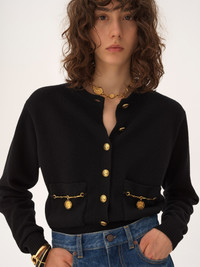 DESCRIPTION Crew-neck cardigan in a merino wool and cashmere knit, featuring gold-tone Horse Medal buttons and patch pockets embellished with jewelry detail. PRODUCT DETAILS Crew-neck cardigan outer shell: 92% Merino wool, 8% Cashmere wool Fit: straight - The model is 5'10" (178 cm) and wears a prototype in size S - Knitted cardigan - Horse Medal buttons through front - Front patch pockets with chain detail Color: Black Item code: CH26SMC07800001 CARE INSTRUCTIONS To preserve the integrity of your garment, please refrain from washing, entrusting its care to professional cleaning services for optimal maintenance. This garment cannot withstand any bleaching agent. To maintain its shape, gently iron this garment at a maximum sole plate temperature of 110°C, taking care to avoid any harsh pressure while ironing. Entrust this garment to a specialist for mild cleaning with tetrachloroethylene and solvent F, ensuring its delicate nature is maintained with the most care. To best preserve its form and texture, please do not tumble dry this garment. To maintain its delicate nature, do not wet clean this garment. TRACEABILITY Better traceability is central to improving our materials as well as social and environmental practices. Dyeing: Italy Knitting: Italy