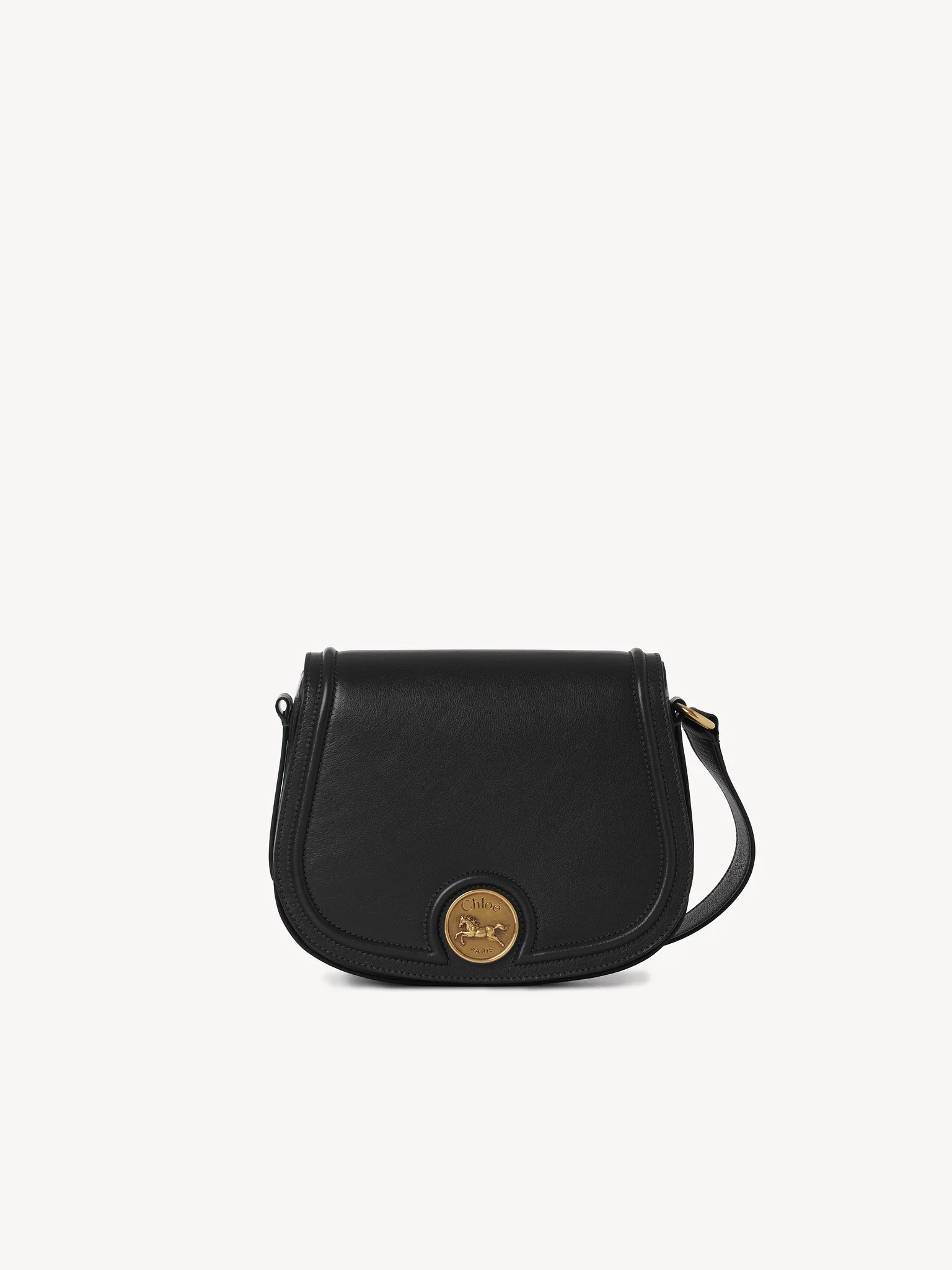 This Horse Medal saddle bag is crafted from grained buffalo leather. The rounded compartment is signed with the Maison's iconic gold-tone medal featuring an embossed image of a galloping horse and a Chloe Paris logo engraving. Wear on the shoulder or crossbody with the adjustable strap. PRODUCT DETAILS Horse Medal saddle bag in grained buffalo leather Main material: Buffalo leather Main lining: 55% Cotton, 45% Linen Flap lining: Buffalo leather Carry: Shoulder & crossbody - 1 main compartment - 1 inside flat card pocket - 1 front slip pocket - 1 adjustable strap - Magnet closure Comes with a dust bag - Width: 9.1" (23 cm) - Height: 7.3" (18.5 cm) - Depth: 2.4" (6 cm) - Min. strap drop: 18.9" (48 cm) - Max. strap drop: 23.6" (60 cm) To make this product, Chloe worked with Leather Working Group (LWG) certified leather manufacturers. LWG certifies tanneries based on their water and energy usage, management of chemicals, solid waste, and wastewater. Color: Black Item code: CH25AS790O37001