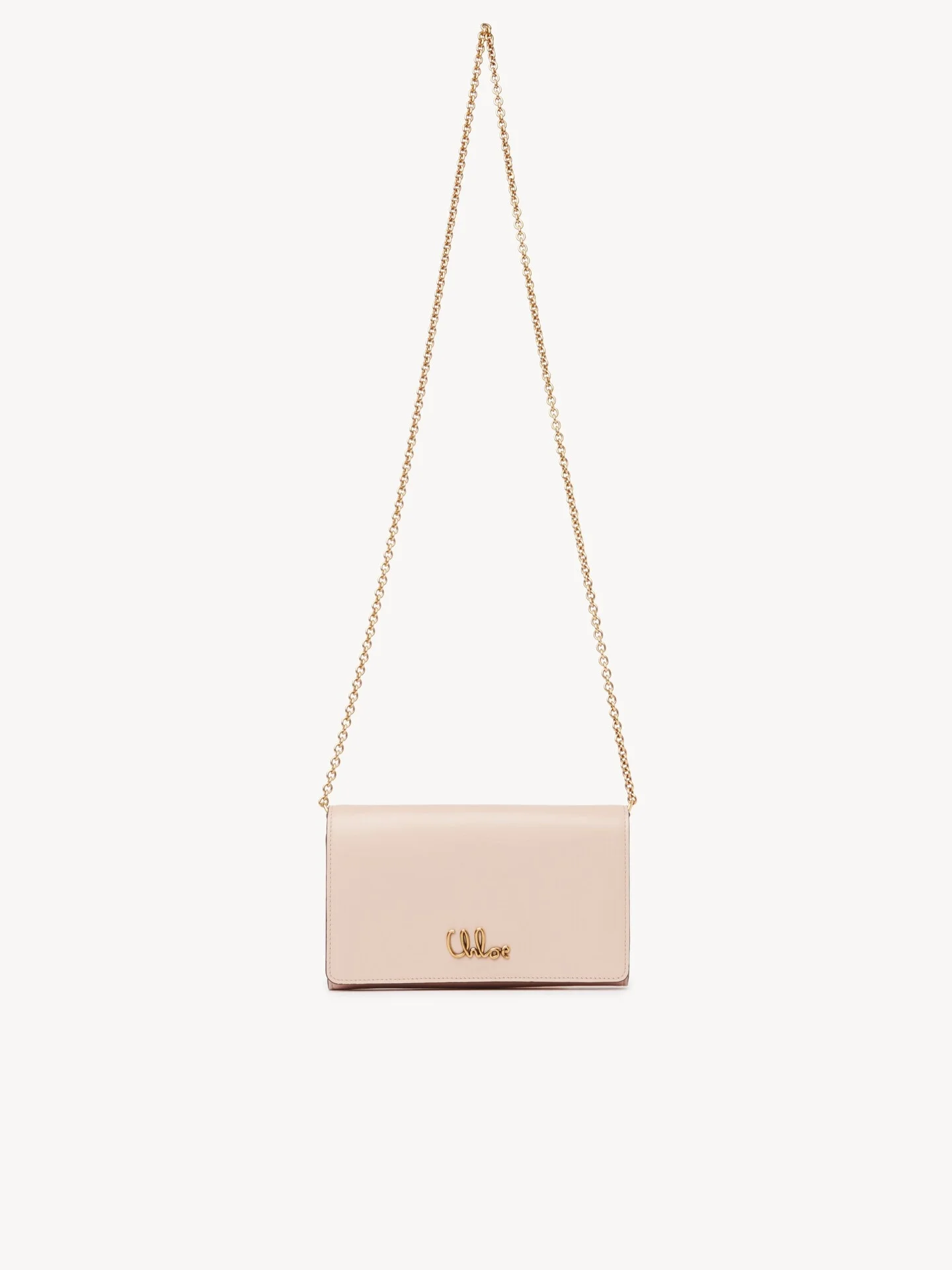 DESCRIPTION Crafted from shiny calfskin, the Chloe Iconic flap wallet on chain combines a minimalist silhouette with a metallic signature from the Maison's archives. Sized to fit your phone, this practical accessory features two compartments, a zipped pocket and multiple card slots. Carry on the shoulder or crossbody. PRODUCT DETAILS Flap wallet on chain in shiny calfskin Main lining: Calfskin Inner lining: 65% Polyester, 35% Cotton Carry: Shoulder & crossbody - 1 chain strap - 1 flap with magnetic closure - 2 main compartments - 1 zipped compartment - 8 card slots - 1 inside flat pocket Comes with a dust bag - Width: 7.5" (19 cm) - Height: 4.7" (12 cm) - Depth: 2" (5 cm) To make this product, Chloe worked with Leather Working Group (LWG) certified leather manufacturers. LWG certifies tanneries based on their water and energy usage, management of chemicals, solid waste, and wastewater. Color: Cement Pink Item code: CH25SP485O166J5 CARE INSTRUCTIONS In order to protect this article, we recommend that you: avoid rubbing against abrasive materials shield it from humidity, light and heat avoid contact with liquids and greasy substances (makeup, cream) store your product carefully in its dustcover when not in use avoid rubbing against color-contrasting clothes or materials. To remove a water stain, gently soak up liquid by dabbing it with a white cloth should a scratch occur on the leather, you can gently massage it with the same type of cloth for all other issues, please contact the Chloe after-sales service or a specialist. TRACEABILITY Better traceability is central to improving our materials as well as social and environmental practices. Dyeing: Italy Finishing: Italy Tanning: Italy