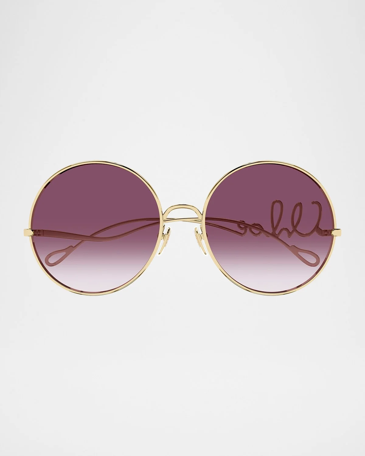 Inspired by the Maison's heritage, the "Chloe Iconic" metal sunglasses are signed with a Chloe Iconic logo insert on the left temple. Dropshaped openings at the temple tips make these sunglasses compatible with Chloe's eyewear jewelry. Lens/bridge/temple (in mm): 6019140 Oversized round frames Gradient lenses Saddle nose bridge Adjustable nose pads Thin, tapered arms 100% UVA/UVB protection Made in Italy