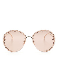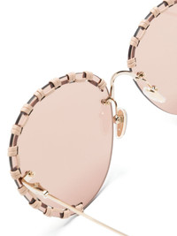Idora round-frame sunglasses Highlights - Gold-tone - Metal - Decorative stitching - Round frame - Red tinted lenses - Rimless lenses - Nose pads - Straight arms - Curved tips - These glasses come with a protective case. Made in Italy Composition Metal 100% SIZE & FIT Measurement Arm Length 5.51 in(14 cm) Bridge Width 0.66 in(1.7 cm) Lens Diameter 2.48 in(6.3 cm) Total Width 5.62 in(14.3 cm)