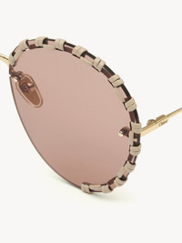 These Idora round sunglasses showcase a new refined style in synergy with the Maison's leather goods and accessories. Rimless bio-based nylon lenses are contoured by hand-stitched leather, lending decorative textural detail. The solid nude lenses complement the feminine allure. The ultra-lightweight metal temples are signed with the Chloé logo engraving, while drop-shaped openings at the temple tips make the sunglasses compatible with Chloé's eyewear jewelry. PRODUCT DETAILS Round sunglasses in metal, bio-based nylon & leather - 100% UVA and UVB protection - Not prescription friendly - Filter category: 2 - Chloé logo engraved on the left temple - Drop-shaped opening at the temple tips These sunglasses come with a case and lens cloth - Lens: 2.5" (63 mm) - Bridge: 0.7" (17 mm) - Temple: 5.5" (140 mm) - Shiny classic Gold frame - Solid nude Lenses - Nude leather stitching Item code: CHC23SEK0186719