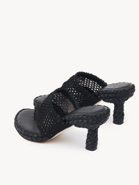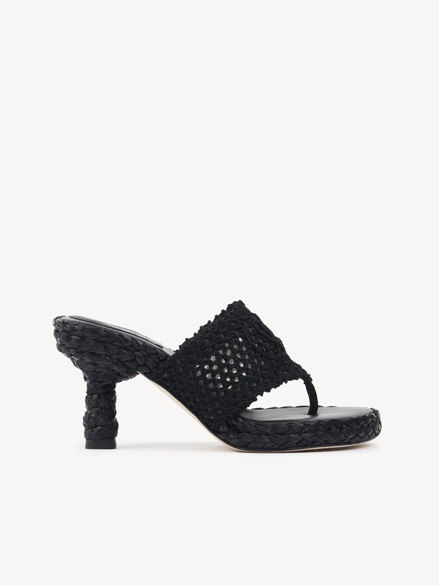 Inspired by the classic espadrille, these Isla heeled sandals feature a crochet-effect thong upper set on a cord structure with a curved heel. Tonal Chloe Iconic embroidery signs the upper. PRODUCT DETAILS Heeled sandal heel height: 3" (7.5 cm) Heel-to-toe drop: 2.4" (6 cm) Upper: viscose Inner sole: lambskin Main lining: lambskin Sole: cowhide Heel: viscose Fit true to size, European sizing - Slip-on Color: Black Item code: CHC25A12VRG001