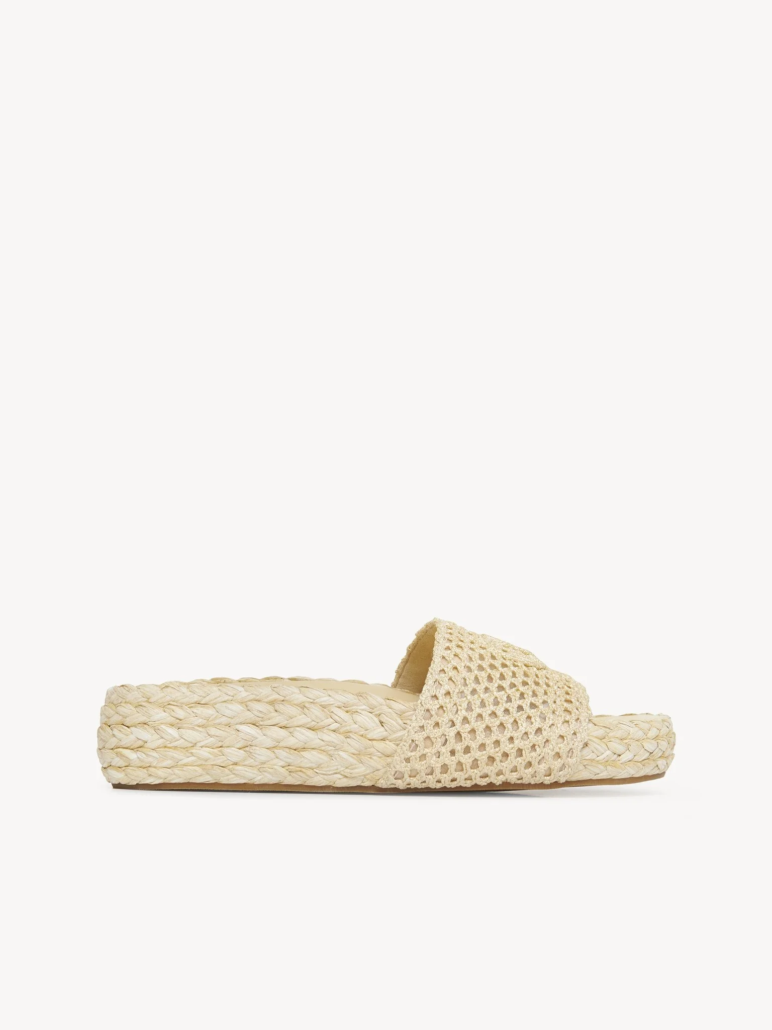 These Isla flatform slides pair a raffia crochet upper with a natural cord sole. The front is embroidered with a handwritten signature inspired by a vintage Chloe belt. PRODUCT DETAILS Flat slide Upper: rayon Inner sole: lambskin Main lining: polyester Secondary lining: lambskin Sole: TPU Heel: viscose Fit true to size, European sizing - Slip-on Color: Natural Brown Item code: CHC25U10NRG243