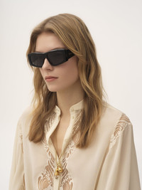 These Izia rectangular sunglasses pair a futuristic black beveled frame in thick lower-impact acetate with solid blue lenses. The tapered temples are signed with the gold-tone Chloe logo plate. PRODUCT DETAILS Rectangular sunglasses in lower-impact acetate & bio-based nylon - 100% UVA and UVB protection - Not prescription friendly - Chloe logo engraved on the temples - Filter category: 3 These sunglasses come with a case and lens cloth - Lens: 2.2" (55 mm) - Bridge: 0.6" (15 mm) - Temple: 5.5" (140 mm) - Black lower-impact acetate frame - Solid blue lenses Item code: CH25SEK0299001