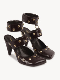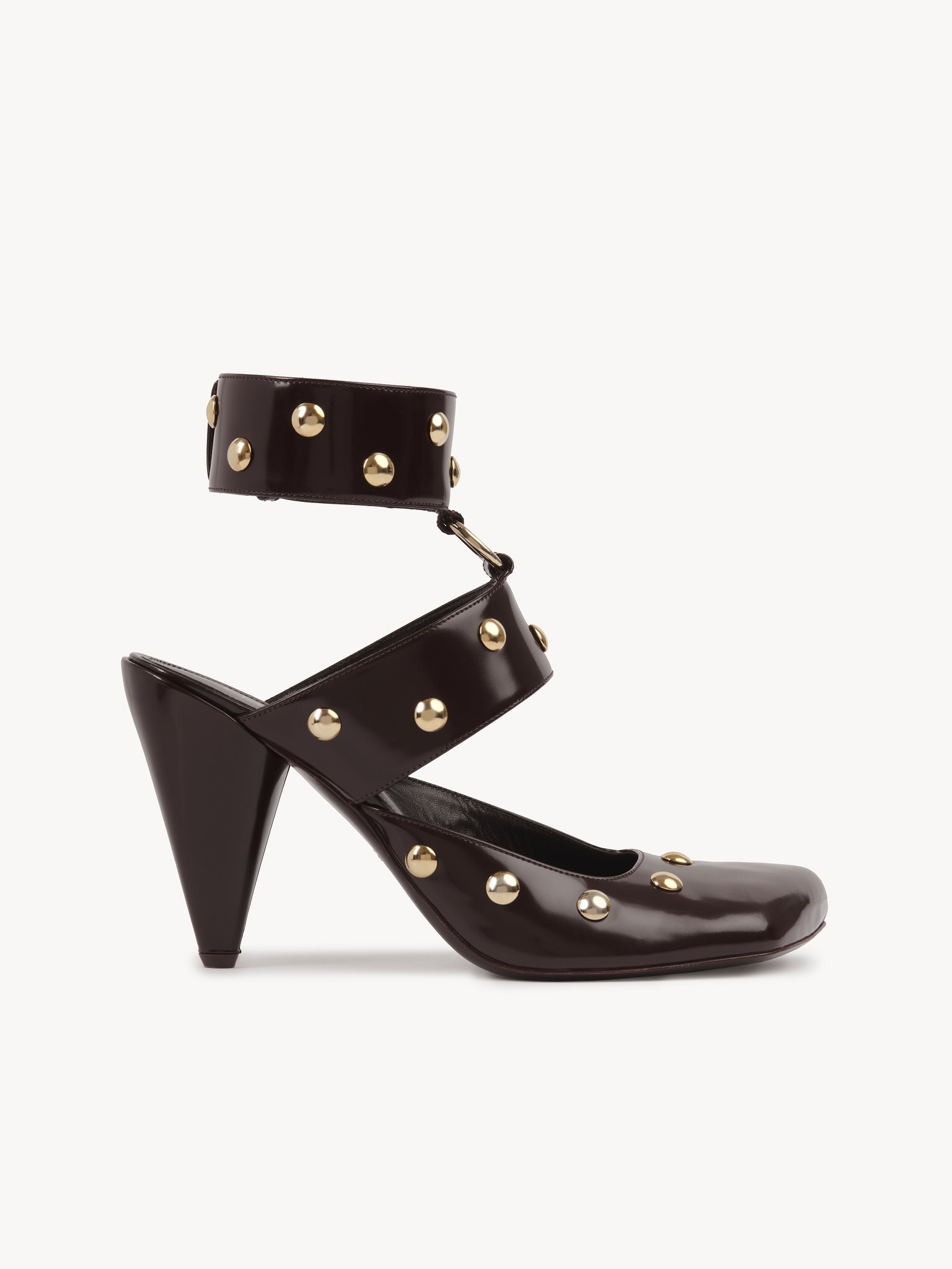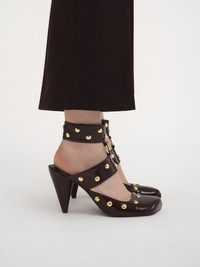 Set on a cone-shaped heel from the Maison's 1979 collection, the Jade high heels are crafted from shiny calfskin embellished with oversized gold-tone studs. Slanted lines and an asymmetrical toe shape combine with double straps on this daring, modern style. PRODUCT DETAILS Pump heel height: 3.5" (9 cm) Heel-to-toe drop: 3.3" (8.5 cm) Upper: calfskin Inner sole: goatskin Main lining: goatskin Sole: cowhide Heel: calfskin Fit true to size, European sizing - Snap button fastening To make this product, Chloe worked with Leather Working Group (LWG) certified leather manufacturers. LWG certifies tanneries based on their water and energy usage, management of chemicals, solid waste, and wastewater. Color: Burnt Purple Item code: CHC24W05POL56D