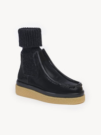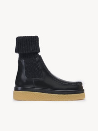 The Jamie flat sock bootie combines a laid-back daywear style with a cool, modern twist. Shiny, elegant calfskin is offset by a soft wool knit for easy comfort and textural depth. The ankle boot’s boyish attitude is elevated by the honey-toned rubber sole, while the timeless scalloped trim along the upper section is a nod to the Maison’s romantic signature. PRODUCT DETAILS Flat sock bootie Heel height: 2” (5 cm) Heel-to-toe drop: 0.4” (0.7 cm) - Upper 1: calfskin - Upper 2: 88% wool, 12% polyamide - Inner sole: calfskin - Main lining: calfskin - Sole: rubber Fit true to size, European sizing - Slip-on sock bootie Color: Black Item code: CHC22A66806001