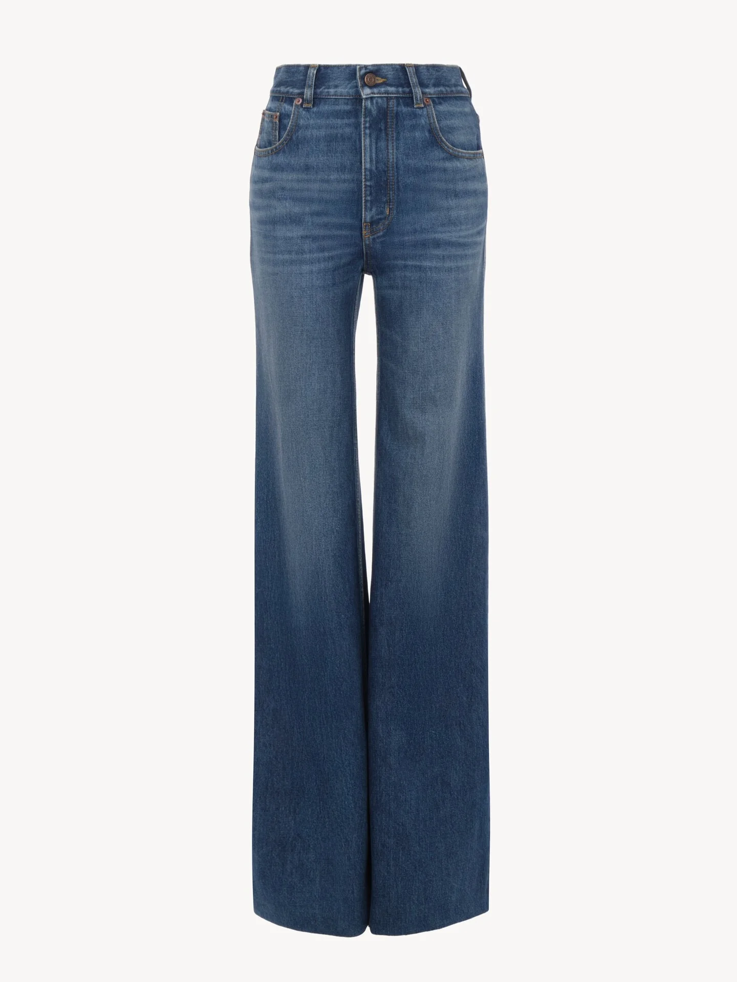 DESCRIPTION High-rise flare jeans in broken blue organic cotton denim. PRODUCT DETAILS High-rise flare jeans outer shell: 100% Cotton Pocket lining: 65% Polyester, 35% Cotton Patch: 100% Calfskin Fit: flared, high waist - The model is 5'10" (178 cm) and wears a prototype in size 24 - High-rise jeans - Front zipper & Chloe-engraved button fastening - Classic 5-pocket design - Belt loops - Leather Chloe patch at back An organic cotton farming system sustains the health of soils, ecosystems and people by eliminating the use of toxic and persistent organic pollutants and increasing water conservation. Color: Hazy Blue Item code: CH25ADP42251427 CARE INSTRUCTIONS To preserve the integrity of your garment wash it at a maximum of 30°C, using a mild process to protect its delicate nature. This garment cannot withstand any bleaching agent. To maintain its shape, gently iron this garment at a maximum sole plate temperature of 110°C, taking care to avoid any harsh pressure while ironing. Entrust this garment to a specialist for mild cleaning with tetrachloroethylene and solvent F, ensuring its delicate nature is maintained with the most care. To maintain its delicate nature, do not wet clean this garment. To best preserve its form and texture, please do not tumble dry this garment. TRACEABILITY Better traceability is central to improving our materials as well as social and environmental practices. Dyeing: Italy Weaving: Italy