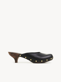 Crafted from shiny cowhide, the Judith clog is set on a wooden kitten heel while the almond toe shape is highlighted with gold-tone studs. A Chloé-branded metal plate on the outsole creates a signature finish. PRODUCT DETAILS Clog heel height: 1.6" (4 cm) Heel-to-toe drop: 1.2" (3 cm) Upper: shiny cowhide Inner sole: calfskin Main lining: calfskin Sole: 80% European beech wood, 20% thermoplastic polyurethane Heel: European beech wood Fit true to size, European sizing - Slip-on To make this product, Chloé worked with Leather Working Group (LWG) certified leather manufacturers. LWG certifies tanneries based on their water and energy usage, management of chemicals, solid waste, and wastewater. Color: Black Item code: CHC24A02VLT001