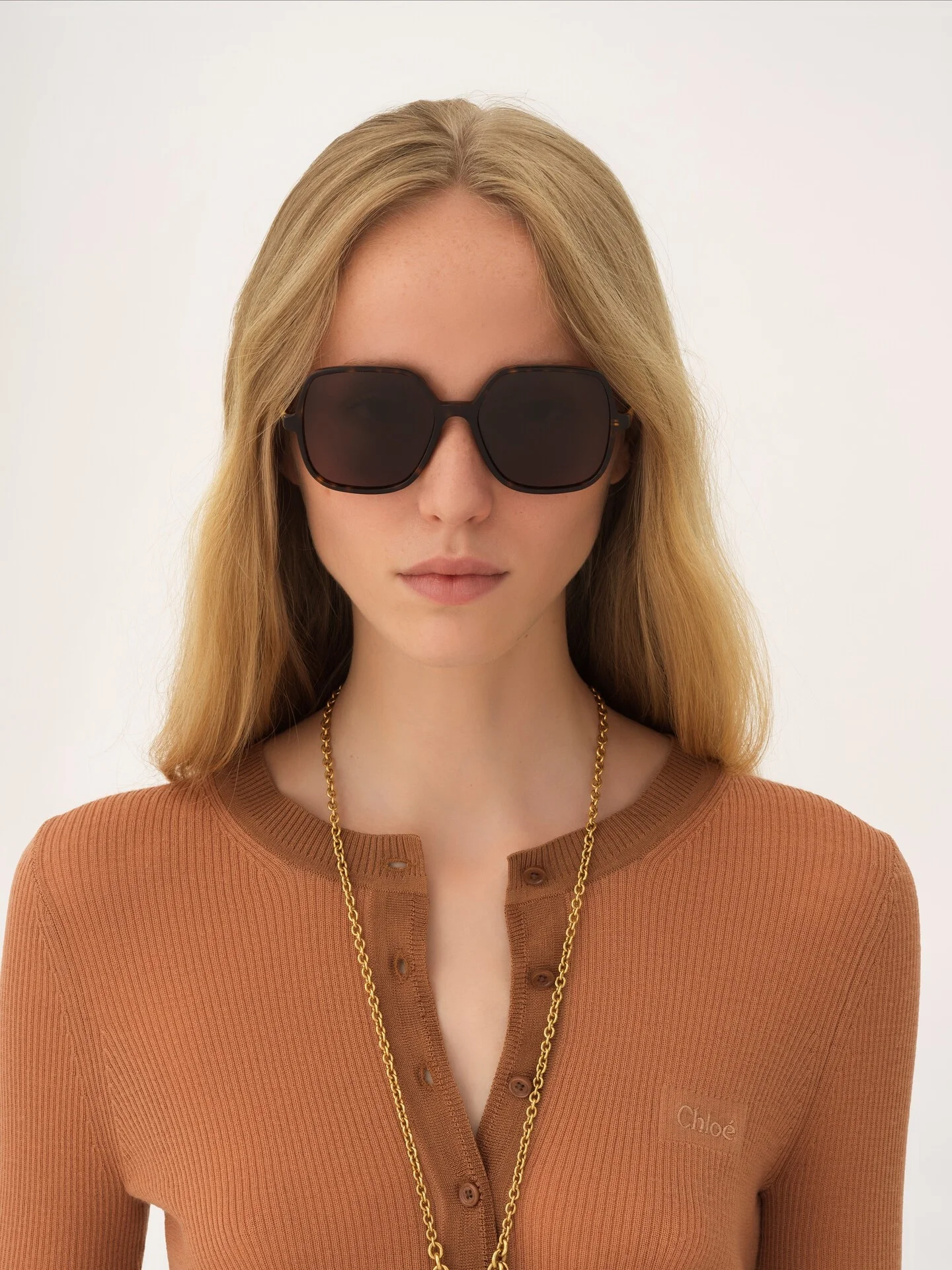 DESCRIPTION These Judy square sunglasses pair a thin, lightweight Dark Havana frame in lower-impact acetate with solid brown lenses. A Chloe-engraved gold metal piece elevates these sunglasses at the temples. PRODUCT DETAILS Square sunglasses in lower-impact acetate & bio-based nylon - 100% UVA and UVB protection - Prescription friendly - Chloe-engraved metal piece on the temples - Filter category: 3 These sunglasses come with a case and lens cloth - Lens: 2.2" (55 mm) - Bridge: 0.6" (16 mm) - Temple: 5.5" (140 mm) - Dark Havana lower-impact acetate frame - Solid brown lenses Item code: CH26SEK0362215 CARE INSTRUCTIONS These sunglasses/eyeglasses are made with carefully selected materials. Please handle with care for a longer product life.- Store in the case provided.- Clean with a soft, dry cloth.- If necessary, use a damp cloth and mild detergent. Do not use solvents or aggressive detergents which may alter the features of the sunglasses/eyewear