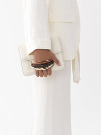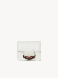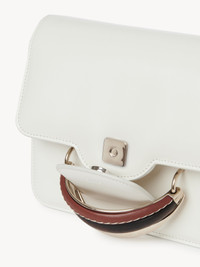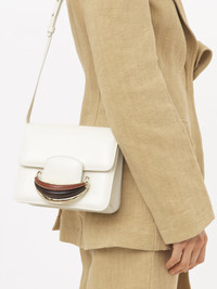 Crafted from shiny calfskin for a sensual feel, this Kattie cross-body bag combines a sleek, masculine silhouette with a bold jewelry signature. The timeless flap design is highlighted by the articulated bracelet in three iconic Chloé materials for rich texture: brass, wood and leather. The elegant gusset construction ensures a roomy main compartment, while the concealed magnet closure complements the clean lines. Carry this day-to-evening bag in hand by the bracelet handle, or on the shoulder or cross-body with the adjustable and removable strap. All about Kattie... The Kattie line pays tribute to the essence of Chloé bags with its bold yet feminine allure heightened by the articulated jewelry signature. It echoes the Maison's characteristic play on masculine and feminine notes. PRODUCT DETAILS Kattie cross-body bag in shiny calfskin Carry: hand, cross-body & shoulder - Magnet closure - 2 main compartments - 1 inner flat pocket - Adjustable & removable strap - Nappa lining Comes with a dust bag - Width: 7.8" (19.7 cm) - Height: 5.7" (14.5 cm) - Depth: 2.8" (7 cm) - Min. strap drop: 15.7" (40 cm) - Max. strap drop: 20.9" (53 cm) This handbag is made from semi-aniline leather. The half-transparent finish imparts a robust nature to the product while preserving its natural character. Follow care instructions on the leaflet. By purchasing this product, you are supporting sustainable leather manufacturing through the Leather Working Group. Color: white Item code: CHC22SS500G14101