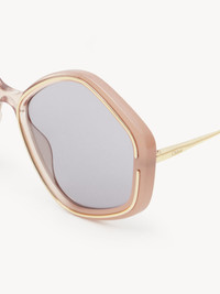 With their striking pentagonal shape, the Kheene sunglasses for women are a modern, statement piece made from metal and an eco-friendly, bio-based material. The solid, light gray lenses are set in gradient, bi-color frames with a gold metal inlay highlighting the bold silhouette. Color-matching temple tips are enhanced with a drop-shaped opening, making these sunglasses for women compatible with Chloé's eyewear jewelry. PRODUCT DETAILS Pentagonal sunglasses for women in a bio-based material & metal - 100% UVA and UVB protection - Adjustable nosepads - Filter category: 2 - Chloé logo engraved on the left temple - Chloé signature at the temple tips: drop-shaped opening trimmed with metal - Can be accessorized with all eyewear jewels These sunglasses for ladies come with a case and lens cloth - Lens: 2.3" (58 mm) - Bridge: 0.7" (17 mm) - Temple: 5.5" (140 mm) - Gold metal & shiny gradient solid brick into transparent nude - Solid light gray lenses Item code: CHC21WEK0061204