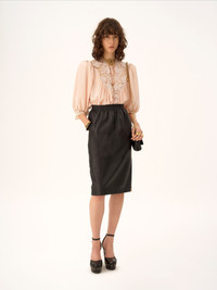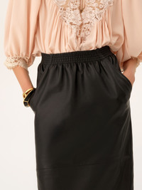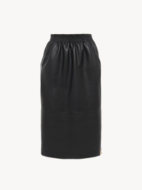 DESCRIPTION Knee-length pencil skirt in plonge nappa leather with an elastic waistband, signed with a gold-tone Chloe logo triangle at the hem. PRODUCT DETAILS Knee-length pencil skirt outer shell: 100% Lambskin Lining: 100% Cupro Fit: straight, knee length - The model is 5'10" (178 cm) and wears a prototype in size 36 - Leather skirt - Elastic waistband - Side pockets To make this product, Chloe worked with Leather Working Group (LWG) certified leather manufacturers. LWG certifies tanneries based on their water and energy usage, management of chemicals, solid waste, and wastewater. Color: Black Item code: CH26SCJ26203001 CARE INSTRUCTIONS To preserve the integrity of your garment, please refrain from washing, entrusting its care to professional cleaning services for optimal maintenance. To maintain its shape, refrain from ironing this garment. To best preserve its texture and form, do not dry clean this garment. To maintain its quality, entrust this garment to a leather specialist only. This garment cannot withstand any bleaching agent. To best preserve its form and texture, please do not tumble dry this garment. To maintain its delicate nature, do not wet clean this garment. TRACEABILITY Better traceability is central to improving our materials as well as social and environmental practices. Dyeing: France Finishing: France Tanning: France