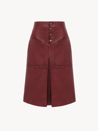 Knee-length skirt in soft lambskin with Chloe-engraved, gold-brushed snap buttons, oversized patch pockets with diagonal zippers, and a front box pleat. PRODUCT DETAILS Knee-length skirt outer shell: 100% Lambskin Main lining: 62% Viscose, 38% Cotton Pocket lining: 100% Cotton Fit: flared, knee length - The model is 5'10" (178 cm) and wears a prototype in size 36 - Knee-length leather skirt - Chloe-engraved gold-brushed snap buttons at front - Oversized front patch pockets with zippers - Front box pleat To make this product, Chloe worked with Leather Working Group (LWG) certified leather manufacturers. LWG certifies tanneries based on their water and energy usage, management of chemicals, solid waste, and wastewater. Color: Dark Ruby Item code: CH25ACJ11204615