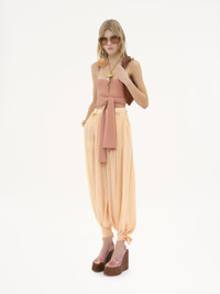 Cropped front-tie tank top in a second-skin shiny viscose knit, combining a square neckline with long ties knotted at the front. Chloe logo embroidery signs this piece on the left. PRODUCT DETAILS Cropped front-tie tank top outer shell: 88% Viscose, 9% Polyamide, 3% Elastane Fit: cropped, fitted - The model is 5'10" (178 cm) and wears a prototype in size S - Cropped tank top - Slips on Care: gentle wash 90°F (30°C) Color: Misty Coral Item code: CH25UMH015306T1