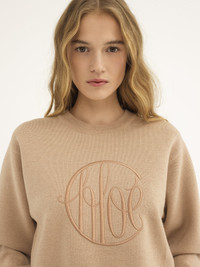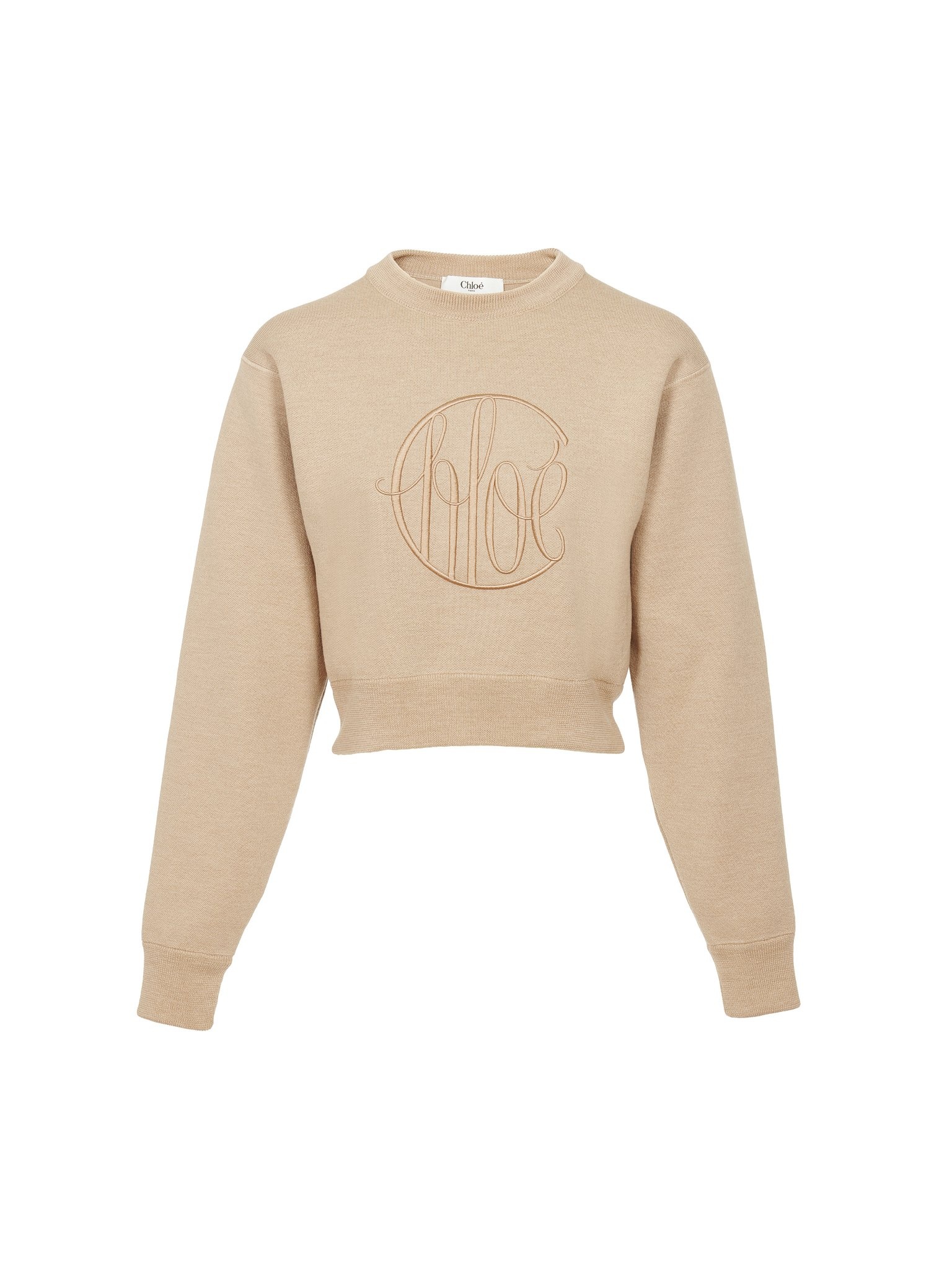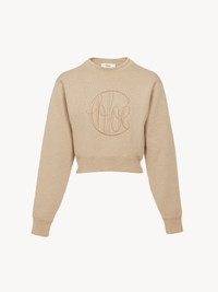Cropped knitted sweater in a lower-impact compact wool knit with tonal Chloé logo embroidery. PRODUCT DETAILS Logo sweater outer shell: 100% Wool Front embroidery: 100% Polyester Care: gentle wash 85°F Fit: cropped, oversized - The model is 5'10" (178 cm) and wears a prototype in size S - Cropped sweater - Slips on The wool used in this product comes from a farm that respects animal welfare, maintains soil health, protects biodiversity and promotes native species. Color: Straw Beige Item code: CHC24AMP54730223