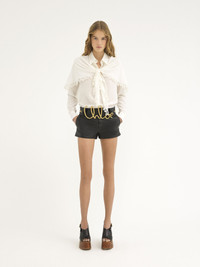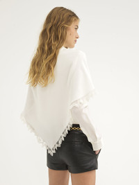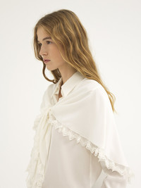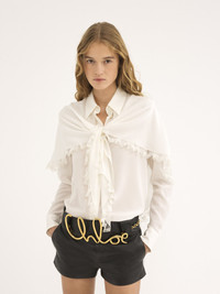 Knotted heritage cape blouse in organic crêpe de chine featuring a fluid cape with zig-zag lace trims. PRODUCT DETAILS Cape blouse outer shell: 100% Silk Embroidery thread: 100% Polyester Buttons: 100% Mother-of-pearl Care: dry cleaning only Fit: straight - The model is 5'10" (178 cm) and wears a prototype in size 36 - Flou silk blouse - Covered button placket through front - Buttons at cuffs This product is made from organic silk. Organic silk manufacturing restricts the use of pesticides, insecticides or harsh chemicals and incorporates methods that respect biodiversity, improve soil quality and reduce water consumption. This product was made in collaboration with Akanjo, a certified WFTO supplier. Akanjo is a social enterprise located in Madagascar that places equal pay and employees' health & wellbeing at the core of their priorities. A long-standing partner of Chloé for 15 years, Akanjo is also committed to training and promoting craftsmanship. Color: Iconic Milk Item code: CH24AHT84004107