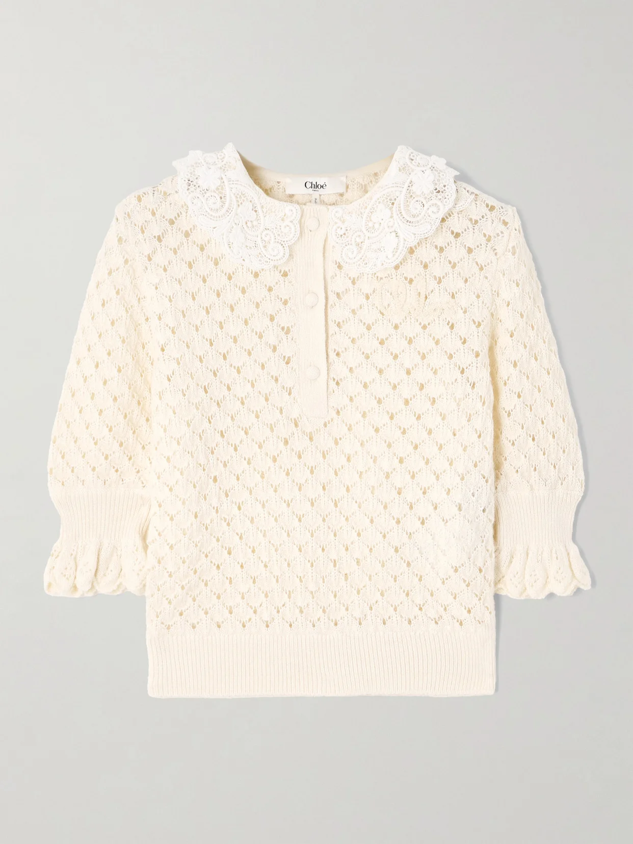 Chloe's sweater is reminiscent of vintage styles. Made from a soft blend of cotton, alpaca and silk, it's pointelle-knitted for a delicate texture and has frilly puffed sleeves and a lace polo collar. Underpin yours with a tonal tank or bralette for coverage.