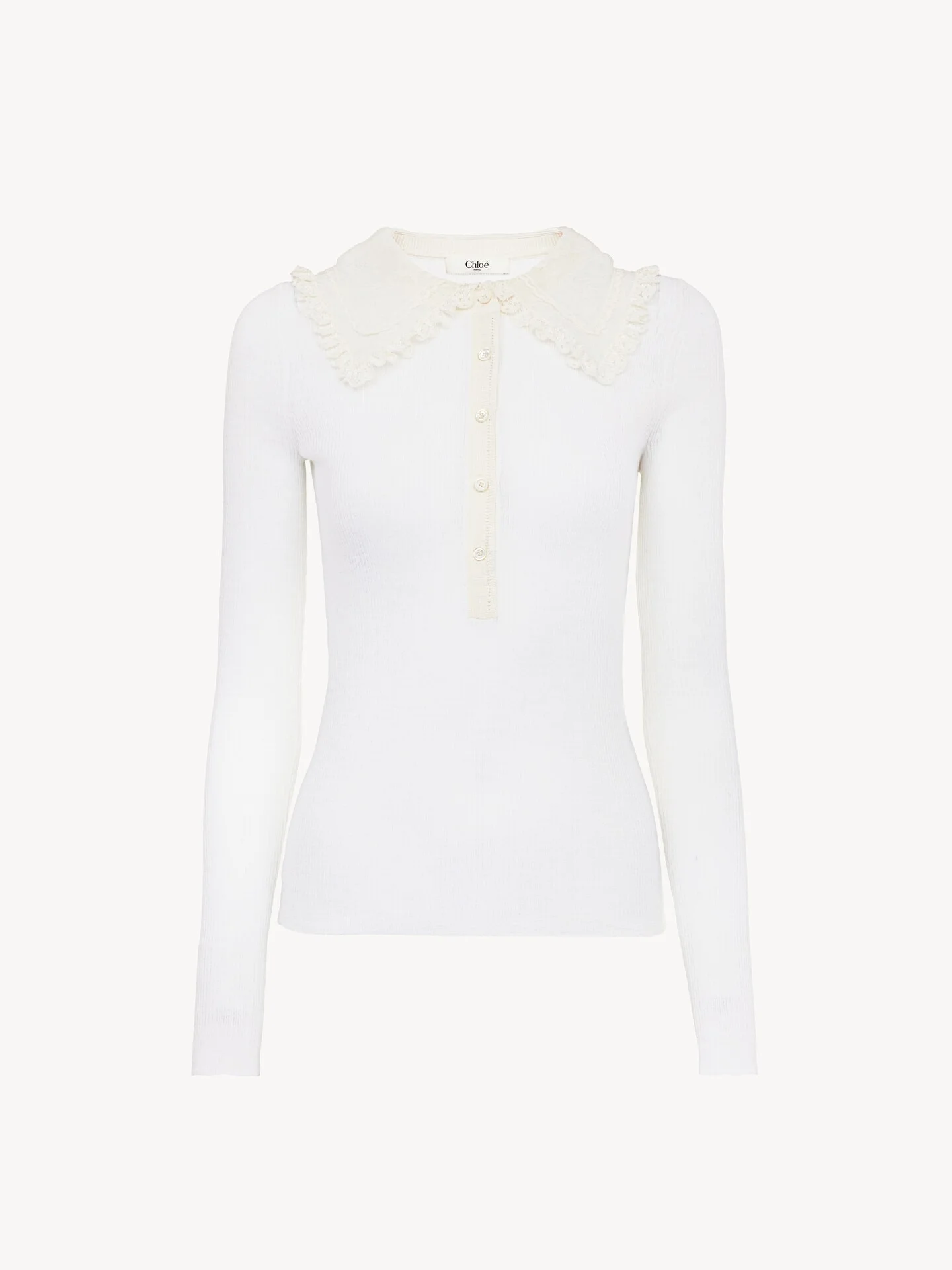 DESCRIPTION Fitted Henley shirt in a superfine wool ribbed knit, featuring a lace-trimmed collar and a mother-of-pearl button placket. PRODUCT DETAILS Henley shirt outer shell: 100% Wool Collar lace: 100% Polyamide Collar braid: 93% Polyester, 5% Viscose, 2% Polyamide Collar: 100% Silk Button placket: 100% Silk Buttons: 100% Mother-of-pearl Fit: fitted - The model is 5'10" (178 cm) and wears a prototype in size 36 - Fitted long-sleeve top - Half-buttoned front This product was made in collaboration with Akanjo, a certified WFTO supplier. Akanjo is a social enterprise located in Madagascar that places equal pay and employees' health & wellbeing at the core of their priorities. A long-standing partner of Chloe for 15 years, Akanjo is also committed to training and promoting craftsmanship. Color: Iconic Milk Item code: CH25AHT58667107 CARE INSTRUCTIONS To preserve the integrity of your garment, please refrain from washing, entrusting its care to professional cleaning services for optimal maintenance. This garment cannot withstand any bleaching agent. To maintain its shape, gently iron this garment at a maximum sole plate temperature of 110°C, taking care to avoid any harsh pressure while ironing. Entrust this garment to a specialist for mild cleaning with tetrachloroethylene and solvent F, ensuring its delicate nature is maintained with the most care. To maintain its delicate nature, do not wet clean this garment. To best preserve its form and texture, dry this garment flat. To best preserve its form and texture, please do not tumble dry this garment.