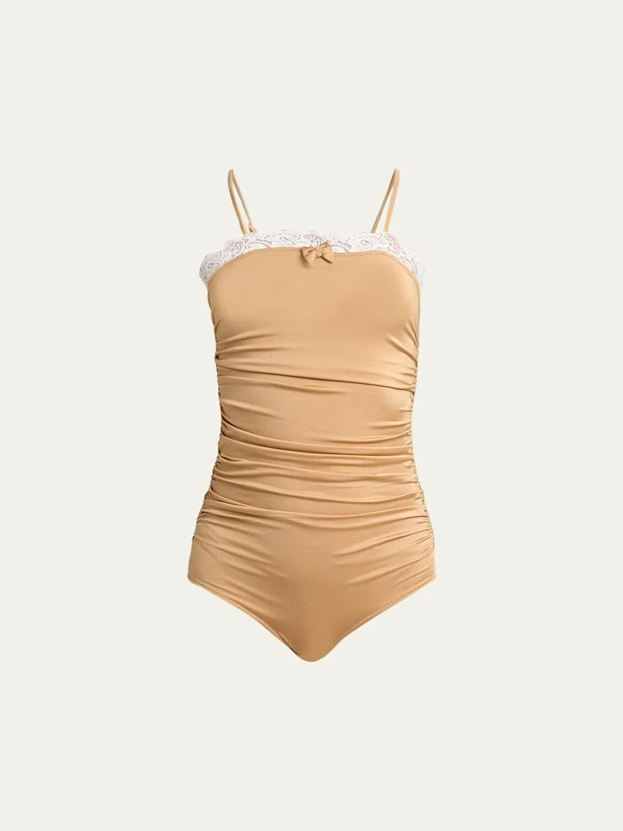 Crafted from stretch jersey, this bodysuit from Chloe features a lace ruffle neckline, bow front, and side ruching Square neckline Sleeveless Adjustable spaghetti straps Full seat coverage Nylon/polyamide/elastane Lining: Nylon/elastane Professional cleaning recommended Made in Italy SIZE amp; FITModel measurements: 5'10" tall Model is wearing a US size 4/Small