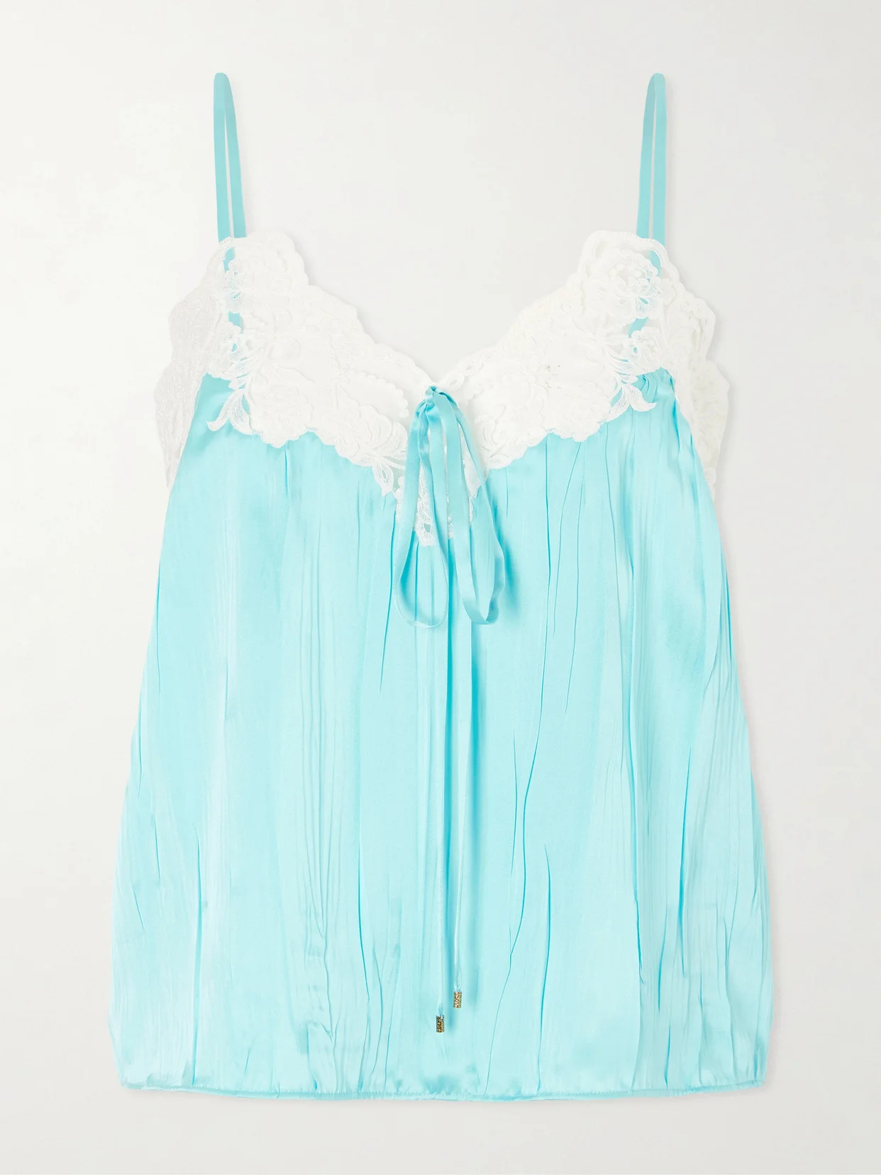 Soft textures and fluid lines define this cami by Chloe. Cut from washed silk satin in a delicate aqua hue, it drapes lightly over the frame, while scalloped lace traces the neckline. Slender straps and a fine tie detail at the front complete the romantic design.