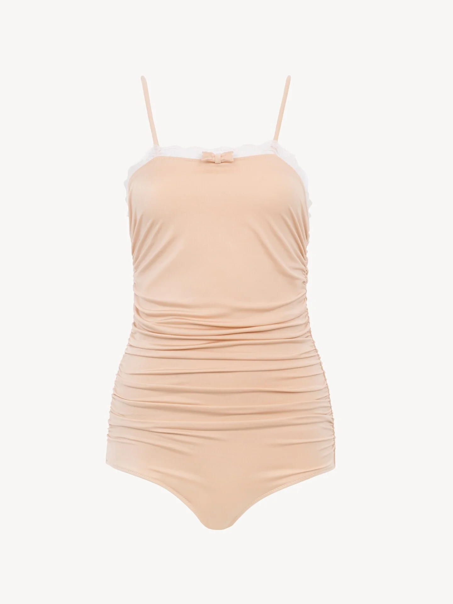 DESCRIPTION Thin-strap ruched bodysuit in shiny stretch nylon, detailed with lace trims and a bow at the neckline. PRODUCT DETAILS Thin-strap bodysuit outer shell: 80% Polyamide, 20% Elastane Lining: 84% Polyamide, 16% Elastane Lacework: 60% Polyamide, 30% Cotton, 10% Elastane Fit: fitted - The model is 5'10" (178 cm) and wears a prototype in size 36 - Ruched bodysuit - Slips on Color: Delicate Pink Item code: CH26UBD339896H6 CARE INSTRUCTIONS To preserve the integrity of your garment wash it by hand at a maximum of 40°C, ensuring its delicate fibers are treated with care. This garment cannot withstand any bleaching agent. Entrust this garment to a specialist for cleaning with tetrachloroethylene and solvent F, ensuring its delicate nature is maintained with the most care. To maintain its shape, gently iron this garment at a maximum sole plate temperature of 110°C, taking care to avoid any harsh pressure while ironing. To best preserve its form and texture, please do not tumble dry this garment. To maintain its delicate nature, do not wet clean this garment.