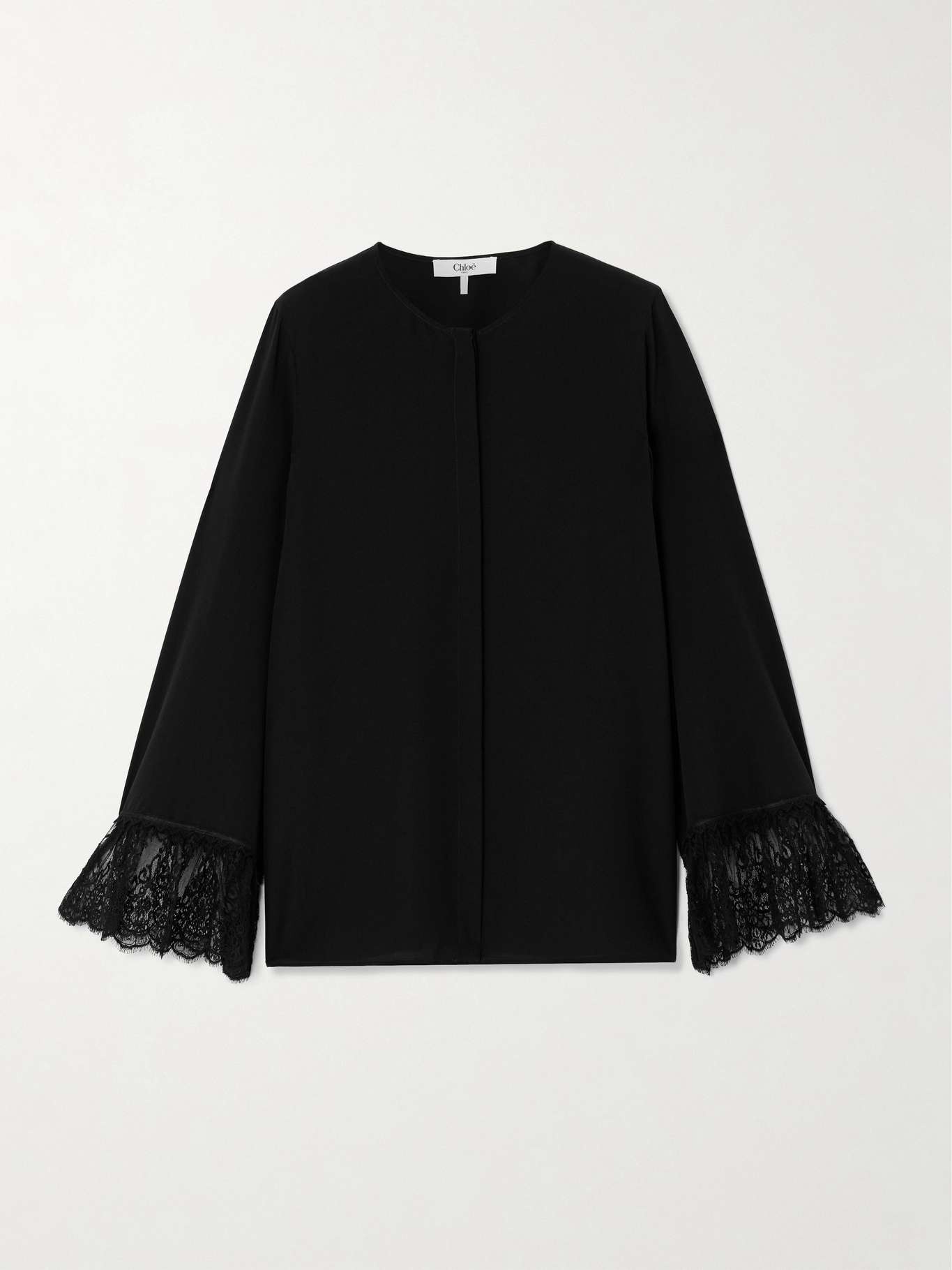 EDITORS'NOTES Delicate lace-trimmed cuffs give Chloe's shirt such a romantic feel. It's made from smooth silk crepe de chine and has a concealed placket to streamline the slightly loose shape. Wear yours tucked into a pair of the Maison's pants. SIZE & FIT Model measurements: - Fits true to size, take your normal size - Designed for a slightly loose fit - Lightweight, non-stretchy fabric - Model is 177cm/ 5'10" and is wearing a FR 36 - Bust: 79cm/ 31" - Waist: 61cm/ 24" - Hip: 89cm/ 35" DETAILS & CARE - Black silk crepe de chine and lace - Concealed button fastenings through front - 100% silk; trim: 66% cotton, 34% viscose - Dry clean - Mother-of-pearl: Australia