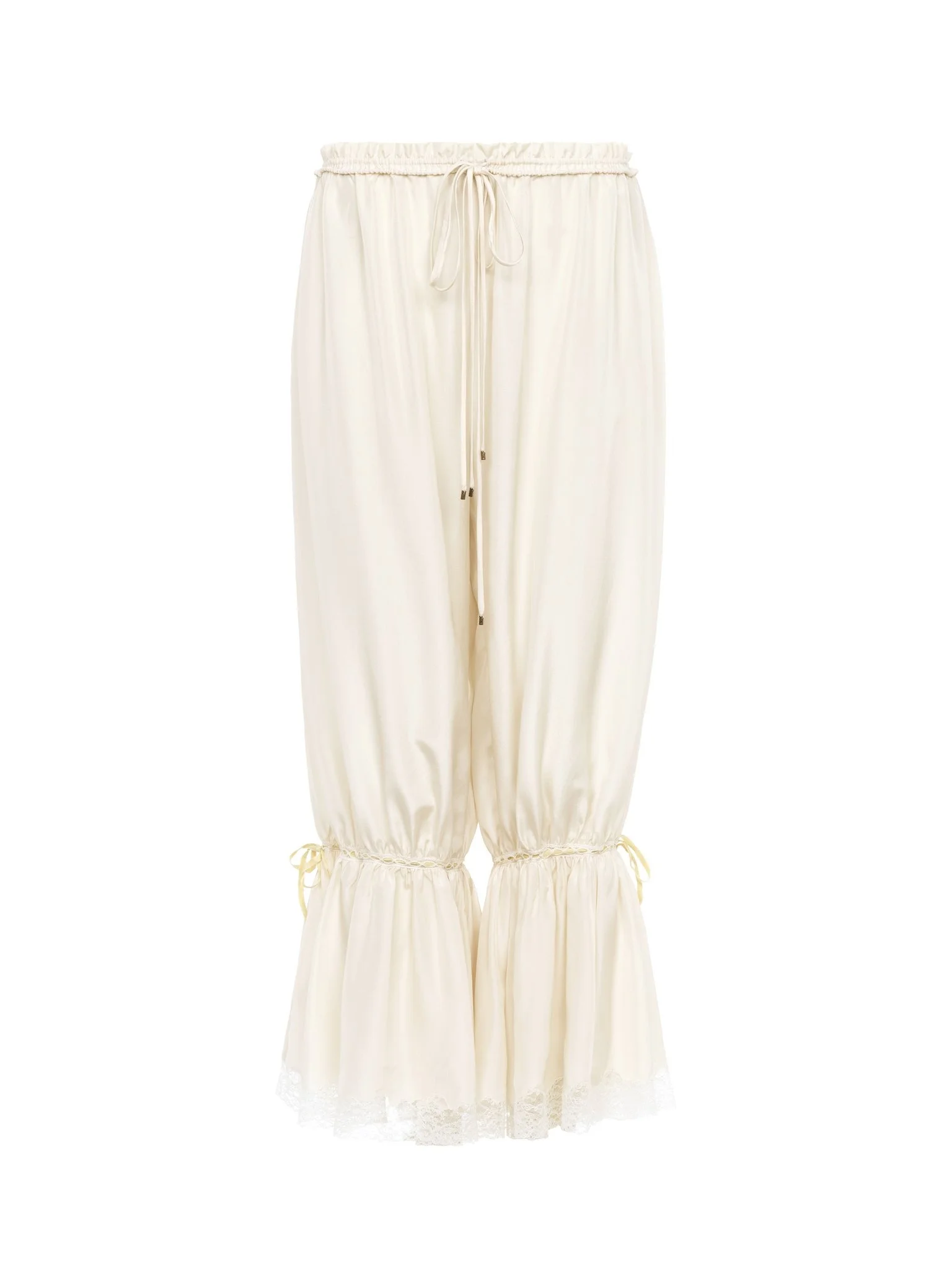 Fluid cropped pants in washed silk ponge with a separate shorts lining. Cinched below the knees by tie fastenings, the pants feature a lace trim at the hem and a drawstring waist detailed with gold-tone metal tips. PRODUCT DETAILS Fluid cropped pants outer shell: 100% Silk Main embroidery: 55% Polyamide, 45% Viscose Braid: 90% Cotton, 10% Polyamide Lining: 68% Acetate fiber, 32% Silk Fit: fluid, cropped - The model is 5'10" (178 cm) and wears a prototype in size 36 - Fluid silk pants - Side pockets - Drawstring waist with metal tips - Separate shorts lining Care: dry cleaning only Color: Coconut Milk Item code: CH25UPA08044103