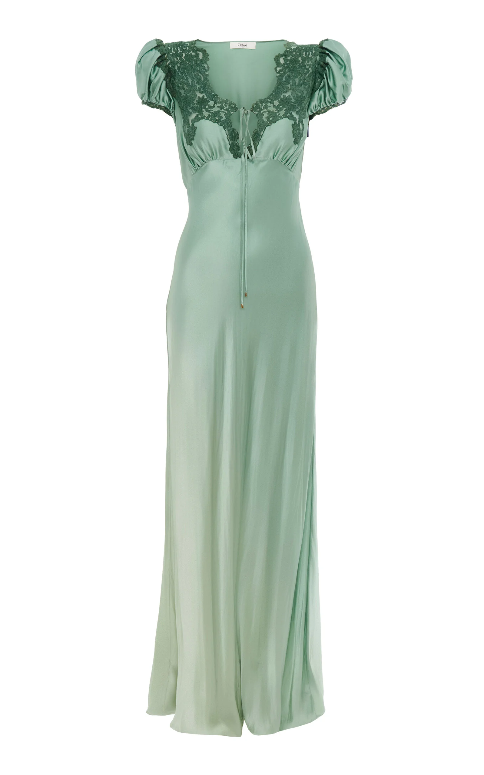 PRODUCT DETAILS - Lace-trimmed, column shape, puff sleeves, lace incrustation, maxi hem - Concealed zip fastening - Composition: Washed Silk Satin - Color: Blurred Green-108 - Dry clean only - France - Fall/Winter '25