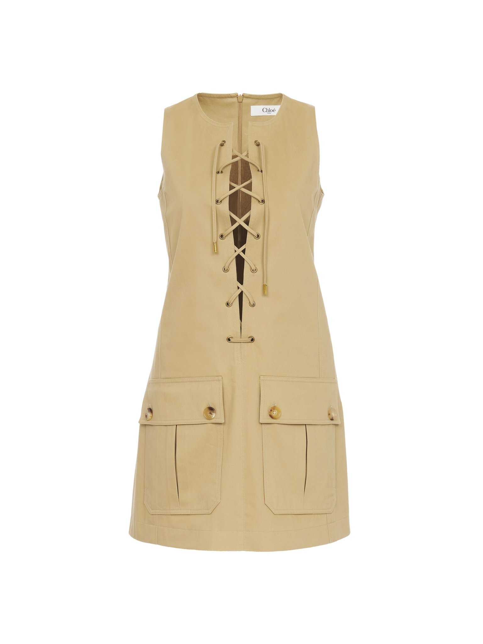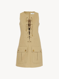 Pinafore dress in organic cotton satin with a lace-up front, horn buttons and front flap pockets. PRODUCT DETAILS Pinafore dress outer shell: 100% Cotton Lining: 51% Viscose, 49% Cotton Buttons: 100% Horn Fit: mini length, straight - The model is 5'10" (178 cm) and wears a prototype in size 36 - Pinafore mini dress - Lace-up front - Engraved horn buttons - Buttoned front pockets - Back zipper - Buttoned tabs at back Care: dry cleaning only An organic cotton farming system sustains the health of soils, ecosystems and people by eliminating the use of toxic and persistent organic pollutants and increasing water conservation. Color: Argil Brown Item code: CH25SRO3633920G