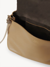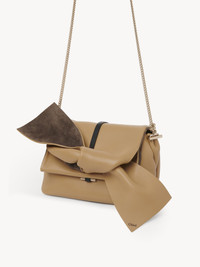 Crafted from nappa lambskin, this Lacey small crossbody bag has a soft, slouchy shape elevated by an oversized, supple knot on the front flap. This detail is a nod to the bow theme that permeates the Maison's Spring-Summer '24 collection. Curvy lines, wrapped details and a contrast leather band create a distinctive design, while the removable knotted chain strap lends a refined finish. All about Lacey… Lacey combines a gentle spirit with an exaggerated wrapped bow that complements a curvy, supple silhouette. PRODUCT DETAILS Small crossbody bag in nappa lambskin Main material: Lambskin Secondary material: Lambskin Main lining: Split calfskin Flap lining: Split calfskin Carry: Shoulder & cross-body - No closure (flap with metal piece) - 1 main compartment - 1 inside flat pocket - Removable chain strap Comes with a dust bag - Width: 10.2" (26 cm) - Height: 4.7" (12 cm) - Depth: 4.7" (12 cm) - Chain strap drop: 21.7" (55 cm) This small bag is made from semi-aniline leather. The half-transparent finish imparts a robust nature to the product while preserving its natural character. Follow all care instructions on the insert. To make this product, Chloé worked with Leather Working Group (LWG) certified leather manufacturers. LWG certifies tanneries based on their water and energy usage, management of chemicals, solid waste, and wastewater. Color: Creamy Brown Item code: CHC24SS315J58272