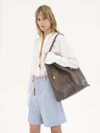 Crafted from shiny grained calfskin, the large Chloe Spin tote bag has a minimalist silhouette elevated with graphic lines. A dangling chain features the Maison's signature Chloe and Horse Medals. Wear on the shoulder or slide the handles through the ring for relaxed hand carry. PRODUCT DETAILS Chloe Spin tote bag in shiny grained calfskin Main material: Cowhide Main lining: Cowhide Carry: Shoulder & hand - 1 main compartment Comes with a dust bag - Width: 13.8" (35 cm) - Height: 15.4" (39 cm) - Depth: 6.2" (16 cm) - Handle drop: 10.2" (26 cm) This tote bag is made from semi-aniline leather. The half-transparent finish imparts a robust nature to the product while preserving its natural character. Follow all care instructions on the insert. This Chloe Spin bag is made with unlined leather, so there may be slight marks inside the bag, such as veins or scratches. Color: Flannel Grey Item code: CHC25SS810N84036