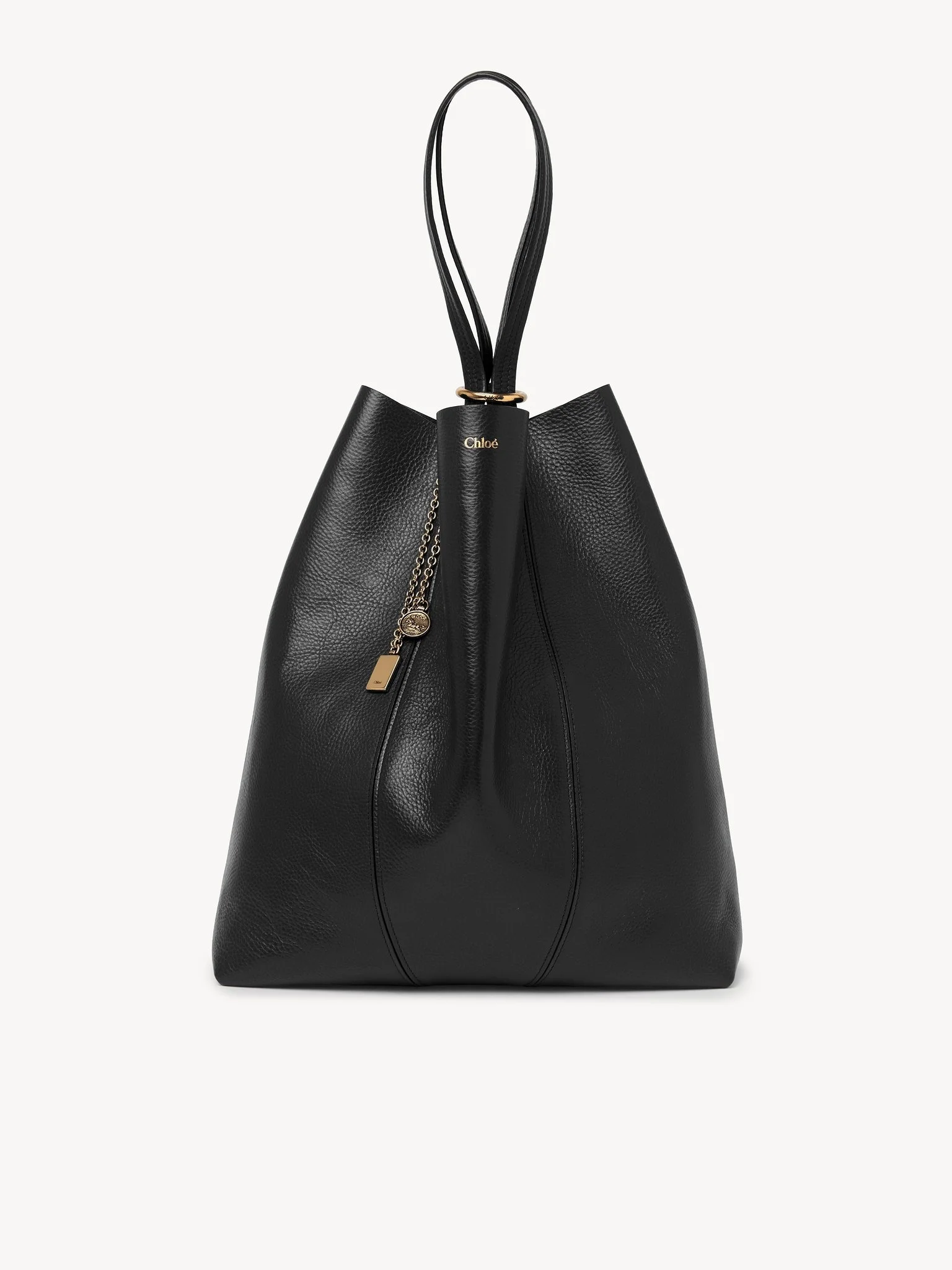Crafted from shiny grained calfskin, the large Chloe Spin tote bag has a minimalist silhouette elevated with graphic lines. A dangling chain features the Maison's signature Chloe and Horse Medals. Wear on the shoulder or slide the handles through the ring for relaxed hand carry. PRODUCT DETAILS Chloe Spin tote bag in shiny grained calfskin Main material: Cowhide Main lining: Cowhide Carry: Shoulder & hand - 1 main compartment Comes with a dust bag - Width: 13.8" (35 cm) - Height: 15.4" (39 cm) - Depth: 6.2" (16 cm) - Handle drop: 10.2" (26 cm) This tote bag is made from semi-aniline leather. The half-transparent finish imparts a robust nature to the product while preserving its natural character. Follow all care instructions on the insert. This Chloe Spin bag is made with unlined leather, so there may be slight marks inside the bag, such as veins or scratches. Color: Black Item code: CHC25SS810N84001