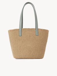 This large Horse Medal basket bag is handwoven from fair-trade paper by independent craftswomen in Kenya. The spacious, rounded compartment is finished with a signature calfskin medal, featuring the Chloe logo and an embossed image of a galloping horse. Carry in the hand or on the shoulder with the double straps. Each basket comes with a leather label signed by the craftsman who made it. PRODUCT DETAILS Large Horse Medal basket bag in fair-trade paper & calfskin Main material: Paper Secondary material: Calfskin Main lining: Paper Carry: Hand & shoulder - 1 main compartment Comes with a dust bag - Width: 7.1" (35 cm) - Height: 7.5" (30 cm) - Depth: 3.1" (25 cm) This model has been handwoven with natural fibers, so the dimensions may slightly vary from one basket to another. - Handle drop: 11" (28 cm) This basket bag is woven from natural fiber in collaboration with Mifuko, which empowers its artisans in Kenya through fair pay and less dependence on unpredictable farming as a source of income. Each basket is a unique handmade piece that weaves together traditional Kenyan handcraft and the story of a strong, independent woman whose signature you will find on the label. Color: Bluish Green Item code: CHC25SS591O8238T