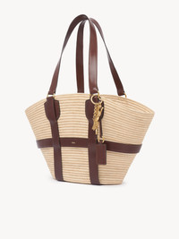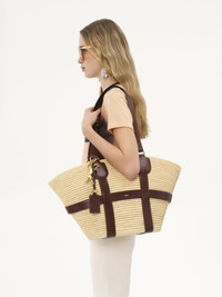 Crafted from raffia and natural calfskin, the large Kerala 25 basket bag features a spacious main compartment embellished with leather bands. A leather tag and gold-tone banana and horse charms create a signature finish. PRODUCT DETAILS Large Kerala 25 basket bag in raffia & natural calfskin Main material: Cellulose paper Secondary material: Calfskin Main lining: Cellulose paper Carry: Shoulder - 1 main compartment Comes with a dust bag - Width: 11.4" (29 cm) - Height: 12.2" (31 cm) - Depth: 5.9" (15 cm) This model has been handwoven with natural fibers, so the dimensions may slightly vary from one basket to another. - Handle drop: 19.3" (49 cm) This basket bag is made from a woven fabrication adapted to leather goods requirements. A water-repellent treatment was applied to the fabric, but rain exposure should be avoided. Avoid rubbing this material against color-contrasting materials and shield it from humidity, light, heat, liquids and greasy substances. Follow all care instructions on the insert. To make this product, Chloe worked with Leather Working Group (LWG) certified leather manufacturers. LWG certifies tanneries based on their water and energy usage, management of chemicals, solid waste, and wastewater. Color: Dark Ebony Item code: CH25US744P1225A