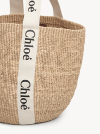 Crafted in a timeless basket shape for an effortless summer mood, this large Woody basket is handwoven by independent craftswomen in Kenya. Echoing the Maison's Woody mule, the line's Chloé logo ribbon details the natural fiber for graphic contrast and a signature touch. The bottom of the basket is protected by a Chloé-embossed round leather patch for durability. Marking the start of a long-term commitment to environmentally and socially responsible production, the basket was made in partnership with the World Fair Trade Organization as part of the first fair-trade luxury collection. The WFTO Guarantee System is an international verification model focused on social enterprises that put the interests of people, workers & artisans, and the planet first. They impact one million livelihoods, 74% of which are women. Each basket is signed by the craftswoman who made it. PRODUCT DETAILS Basket in fair-trade paper with the Woody ribbon Carry: hand & shoulder - 1 spacious main compartment Comes with a dust bag - Width: 13.8" (35 cm) - Height: 11.8" (30 cm) Please note: the height may vary slightly from one basket to another, as each piece is woven by hand. - Depth: 9.8" (25 cm) - Strap drop: 23 cm (9.1") This handbag is woven from natural fiber in collaboration with Mifuko, which empowers its artisans in Kenya through fair pay and less dependence on unpredictable farming as a source of income. Each basket is a unique handmade piece that weaves together traditional Kenyan handcraft and the story of a strong, independent woman whose signature you will find on the label. Follow the care instructions on the leaflet. Color: White Item code: CHC22SS380G55101