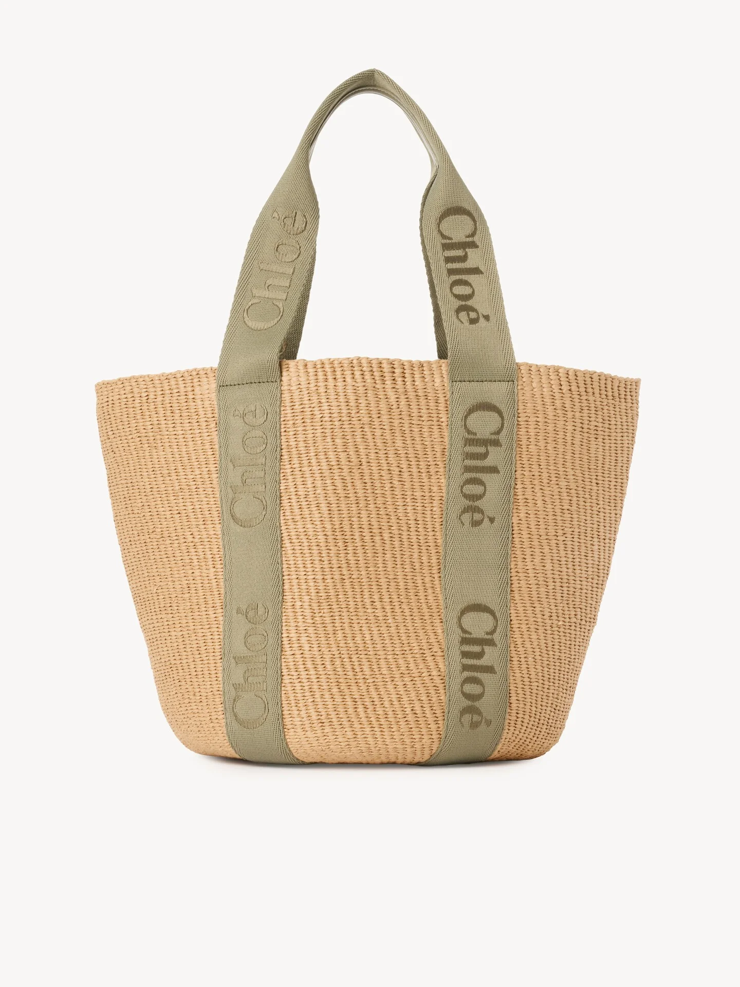 DESCRIPTION This large Woody basket bag is handwoven from fair-trade paper by independent craftswomen in Kenya. It is finished with signature canvas ribbons embroidered with the Chloe logo. Each basket features a leather label signed by the artisan who crafted the bag. Carry yours in your hand or on the shoulder with the double handles. PRODUCT DETAILS Large Woody basket bag in fair-trade paper, calfskin & polyester webbing with Chloe logo embroidery Main material: Paper Secondary material: Calfskin Lining: Paper Trim: Polyester Carry: Hand & shoulder - 1 spacious main compartment Comes with a dust bag - Width: 13.8" (35 cm) - Height: 11.8" (30 cm) Please note: the height may vary slightly from one basket to another, as each piece is woven by hand. - Depth: 9.8" (25 cm) - Strap drop: 9.1" (23 cm) This basket bag is woven from natural fiber in collaboration with Mifuko, which empowers its artisans in Kenya through fair pay and less dependence on unpredictable farming as a source of income. Each basket is a unique handmade piece that weaves together traditional Kenyan handcraft and the story of a strong, independent woman whose signature you will find on the label. Color: Aloe Green Item code: CHC23AS380L183D6 CARE INSTRUCTIONS Each piece has been carefully selected for its natural beauty. Any irregularities and colour variations are inherent to this kind of natural fibre and a result of artisanal finishing. Protection from direct light, heat and rain is advised. Should the item become wet, dry it immediately with a soft cloth. Due to its slightly abrasive surface, we advise you to avoid contact with delicate materials. Avoid intense rubbing with abrasive materials. Fill the bag with tissue paper to help maintain its shape and store in the provided dust bag. Leather parts can be cleaned using a soft and dry cloth. TRACEABILITY Better traceability is central to improving our materials as well as social and environmental practices. Dyeing: Italy Finishing: Italy Weaving: Spain Tanning: Italy
