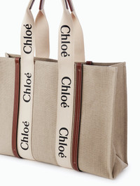 Crafted from lower-impact linen canvas detailed with shiny calfskin strips, this large Woody tote bag is a spacious bag with a strong summer attitude. The roomy inside compartment includes a practical flat pocket. The bag's sharp, modern lines are emphasized by the contrasting vertical leather strips and the signature Chloé logo ribbon carried over from the Maison's Woody mule. Carry this tote bag comfortably on the shoulder. PRODUCT DETAILS Tote bag in linen canvas & shiny calfskin with Woody ribbon Carry: shoulder & hand - 2 long handles - 1 spacious main compartment - 1 internal flat pocket Comes with a dust bag - Width: 17.7" (45 cm) - Height: 13" (33 cm) - Depth: 5.2" (13 cm) - Strap drop: 9.8" (25 cm) This handbag is made from linen. In an effort to limit its environmental impact and have a positive influence on society, Chloé is accelerating its transition to more responsible sourcing. This progress is most notably reflected in the introduction of linen—an inherently lower-impact material—to the collection. Respect care instructions on the leaflet. By purchasing this product, you are supporting sustainable leather manufacturing through the Leather Working Group. Color: White & Brown Item code: CHC22AS382I2690U