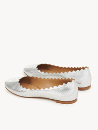 Crafted from python-print shiny calfskin, this Lauren ballerina matches round lines with Lauren's signature scalloped edges. The cushioned footbed makes these ballet shoes a comfortable day-to-evening piece. PRODUCT DETAILS Flat ballerina Upper: python-print shiny calfskin Inner sole: lambskin Main lining: lambskin Sole: 95% cowhide, 5% thermoplastic polyurethane Fit true to size, European fit - Slip-on To make this product, Chloé worked with Leather Working Group (LWG) certified leather manufacturers. LWG certifies tanneries based on their water and energy usage, management of chemicals, solid waste, and wastewater. Color: Silver Item code: CHC24A160NI9DL