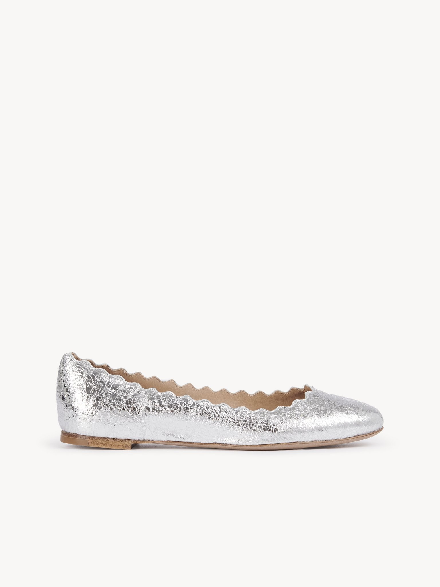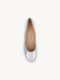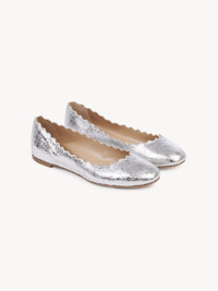 This Lauren ballet flat showcases the soft round lines and gentle femininity characteristic of the Maison. The signature Lauren scalloped edges lend a romantic charm, while striking metallic leather taps into the Spring-Summer '23 collection's fusion energy inspiration. A timeless classic, this ballet flat is a comfortable favorite for an effortlessly elegant look. PRODUCT DETAILS Ballet flat heel height: 0.4” (10 mm) - Upper: coated sheepskin - Heel: calfskin - Sole: 90% nubuck cowhide, 10% rubber - Main lining: goatskin Fit true to size, European fit - Ballet flat - Slip on - Cushioned footbed Color: Silver Item code: CHC23U160DV9DL