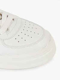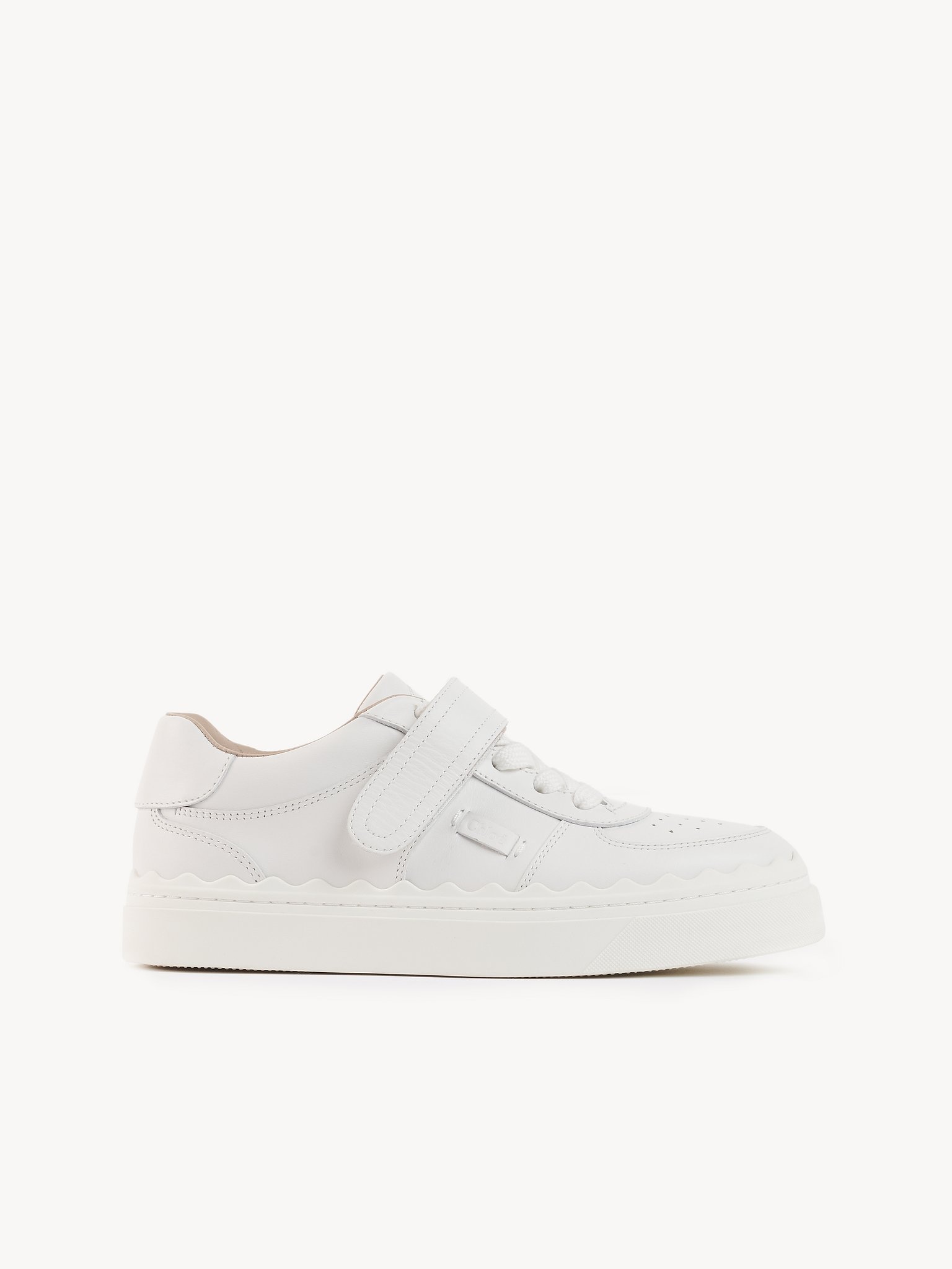 The classic Lauren sneaker is reinterpreted with a Velcro strap and modern details in this version. Made from all-white smooth calfskin, this lace-up sneaker is an active daywear option rooted in the Chloé DNA. The easy-wearing, low-top design showcases a sporty aesthetic, enhanced by the recycled rubber sole, the padded ankle and the subtle Chloé logo at the side. The signature Lauren scallops lend a romantic touch, while the round toe shape adds a feminine finish to this comfortable platform sneaker. PRODUCT DETAILS Flat sneaker platform height: 1.2” (3 cm) - Inner sole: sheepskin - Upper 1: cowhide - Upper 2: 90% polyester, 10% nylon - Sole: 85% polyurethane, 15% thermoplastic polyurethane - Main lining: sheepskin - Secondary lining: suede sheepskin Fit true to size, European fit - Lace-up sneaker - Velcro strap By purchasing this product, you are supporting sustainable leather manufacturing through the Leather Working Group. Color: White Item code: CHC22W70242101