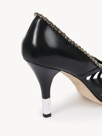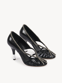 These Leonie pumps are crafted from a mix of sheepskin and strass. They feature a subtle open toe and cut-out details while the heel is set with a silver insert engraved with the Chloe logo. PRODUCT DETAILS Pump heel height: 3.7" (9.5 cm) Heel-to-toe drop: 3.5" (9 cm) Upper: sheepskin Inner sole: goatskin Main lining: goatskin Sole: cowhide Heel: 50% acrylonitrile butadiene styrene, 50% sheepskin Fit true to size, European sizing - Slip-on To make this product, Chloe worked with Leather Working Group (LWG) certified leather manufacturers. LWG certifies tanneries based on their water and energy usage, management of chemicals, solid waste, and wastewater. Color: Black Silver Item code: CHC25S07LPP0ZZ