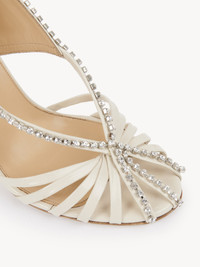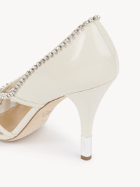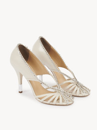 These Leonie pumps are crafted from a mix of sheepskin and strass. They feature a subtle open toe and cut-out details while the heel is set with a silver insert engraved with the Chloe logo. PRODUCT DETAILS Pump heel height: 3.7" (9.5 cm) Heel-to-toe drop: 3.5" (9 cm) Upper: sheepskin Inner sole: goatskin Main lining: goatskin Sole: cowhide Heel: 50% acrylonitrile butadiene styrene, 50% sheepskin Fit true to size, European sizing - Slip-on To make this product, Chloe worked with Leather Working Group (LWG) certified leather manufacturers. LWG certifies tanneries based on their water and energy usage, management of chemicals, solid waste, and wastewater. Color: Pearly Ivory Item code: CHC25S07LPP27G