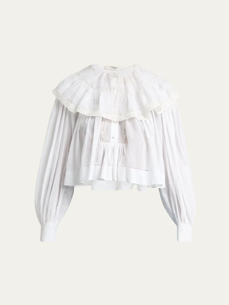Adorned with a ruffled capelet design and delicate lace detailing, this Chloe blouse in gathered light cotton voile captures the essence of vintageinspired charm with modern styling ease Round neckline; button front Blousonstyle long sleeves; button barrel cuffs Loose fit Cropped length Cotton/nylon/polyamide Dry clean Imported