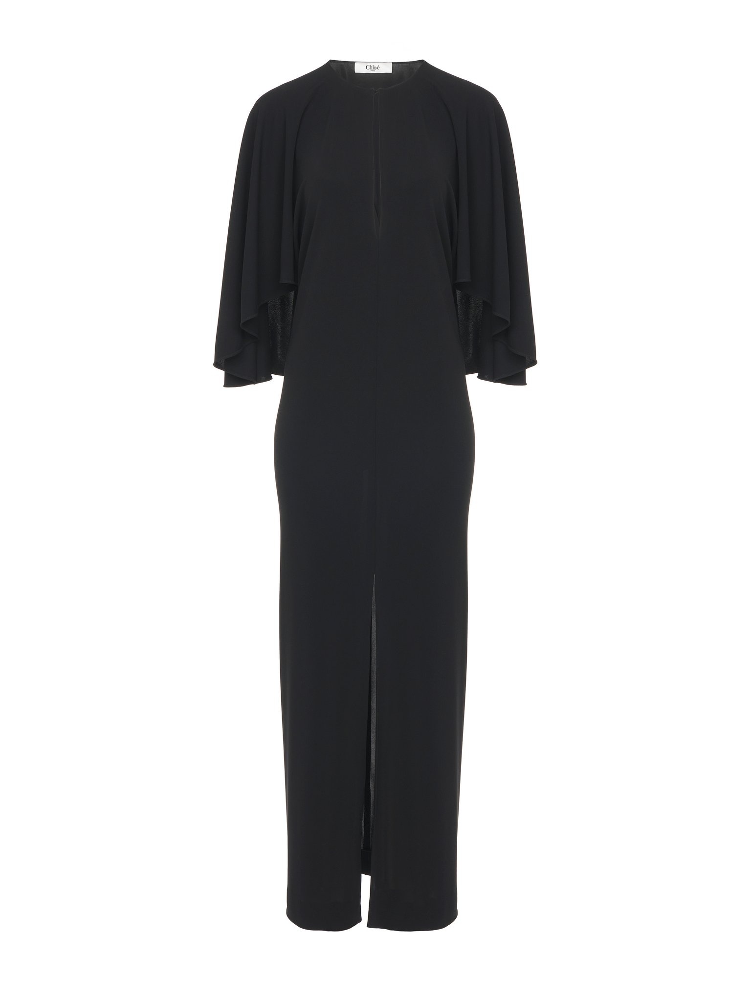 Long cape dress in fluid crêpe jersey with a column silhouette, featuring a front slit and a cape. PRODUCT DETAILS Long cape dress outer shell: 100% Viscose Care: dry cleaning only Fit: long - The model is 5'10" (178 cm) and wears a prototype in size 33/34 - Black evening dress - Invisible front & back zipper - Hook fastening at neck Color: Black Item code: CHC24ARO09081001